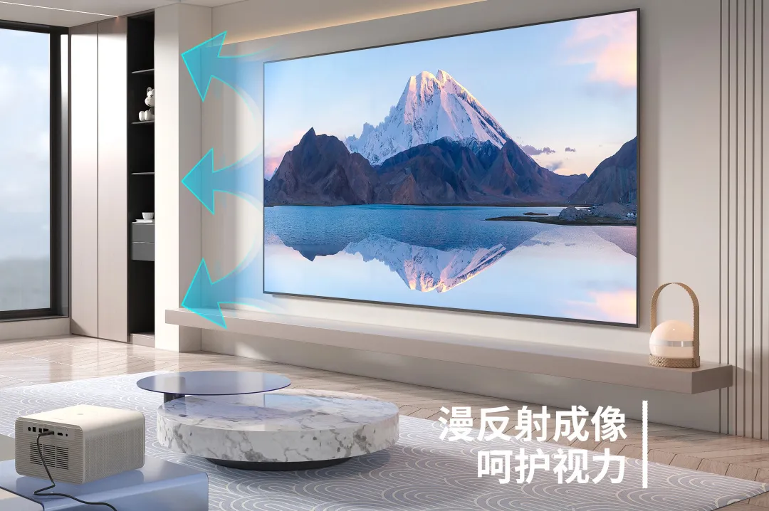 在保护视力方面,因为投影幕布采用漫反射成像原理,即投影机将光线投射到幕布上,再经由幕布反射到人眼,所以成像画面整体较为柔和,对眼睛刺激小。而电视机由于背光源发光成像的原理,长时间观看更容易导致眼睛受到蓝光影响进而产生视觉疲劳。