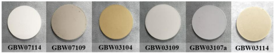 本章总共使用了 163 个岩石样品,使用涡旋混匀器将其混合均匀后所得。采集自录井现场的岩屑样品来自我国西南地区某录井现场同一口井的不同深度,按照深度逐渐增加顺序将其编号设为 LJ #01~LJ #97。该批样品的目标元素含量依据国标 GB/T 14506.28-2010 硅酸盐岩石化学分析方法和 JY/T 0569-2020 波长色散 X 射线荧光光谱分析方法通则检测获得。实验中所使用的岩石样品都是均匀的粉末,5 种目标元素含量详见附录 B 中的表 1 和表 2。使用电热恒温干燥箱将样品在 60℃干燥 2 小时后,称取 1 g,使用自动压片机在 8 Mpa 压强持续保压 20s 的条件下压制成圆片状样本,直径为 20 mm。图1 展示了代表性压片样本。