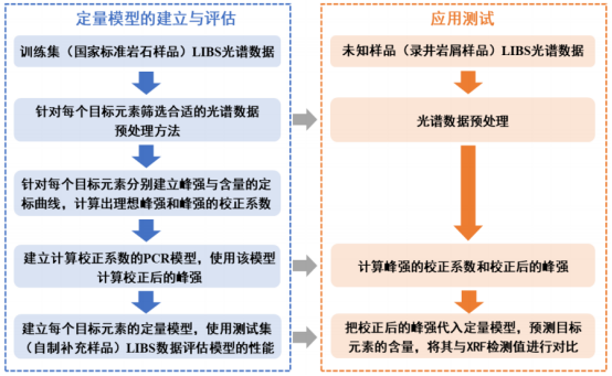在本章的工作中,将 49 个国家标准岩石样品的光谱数据划分为训练集数据,17 个自制的补充样品的光谱数据划分为测试集数据。以训练集数据为基础分别建立 5 种目标元素的定量分析模型,再利用测试集数据来评估模型的性能。在应用测试中,将 97 个录井岩屑作为未知样品,使用 LIBS 仪器及配套的分析测试软件调用该定量模型封装而成的算法程序来检测 5 种目标元素的含量,将其结果与目前在录井现场岩屑元素分析中应用最为广泛的 XRF 技术的检测结果进行对比,评估该仪器实际应用的可行性。图2 展示了数据分析的整体流程。
