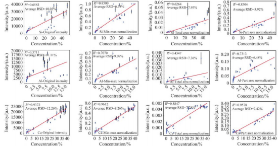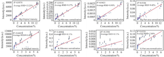 对于 Ca 元素,最优方法是最大最小强度归一化,归一化之后的平均 RSD为 8.26 %,相比于原始 RSD 下降了 32.6 %,R 2 从 0.9372 提高到 0.9612;对于 Mg 元素,最优方法是总面积归一化,归一化之后的平均 RSD 为 8.90 %,相比于原始 RSD 下降了 32.7 %,R 2 变化不大;对于 Si、Al 和 K 元素,最优的方法是部分面积归一化,归一化之后的平均 RSD 分别为 5.92 %、6.48 %和7.89 %,相比于原始 RSD 分别下降了 41.0 %、41.7 %和 24.8 %,其中 Si 元素和 Al 元素的 R 2 得到了明显的提升,分别为 0.8304 和 0.7313。