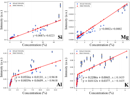 Ca 元素在最大最小强度归一化之后的定标曲线 R 2为 0.9612,比较理想,基于此结果建立了 Ca 元素的定量模型。虽然 Mg、Si、Al 和 K 元素 R 2 不够理想,以此为基础直接建立定量模型难以实现较为准确的定量分析。因此,本章工作提出了一种基于主成分回归(PCR)的光谱强度校正的方法。首先需要根据最优归一化之后的结果,拟合出 Mg、Si、Al 和 K 元素的定标曲线,通过该曲线计算出各元素在不同含量下对应的理想峰强和峰强的校正系数。从图5 中可以发现,在不同的含量范围,Al 元素和 K 元素的特征峰强度和含量之间虽然总体上都是正相关的,但是趋势明显不同。为了更好地反映特征峰强随含量变化的趋势,采用分段拟合的方法,在较低含量和较高含量范围分别拟合出定标曲线。理想峰强的计算公式和理想峰强与实际峰强如图6 所示,根据公式就可以计算出峰强的校正系数。