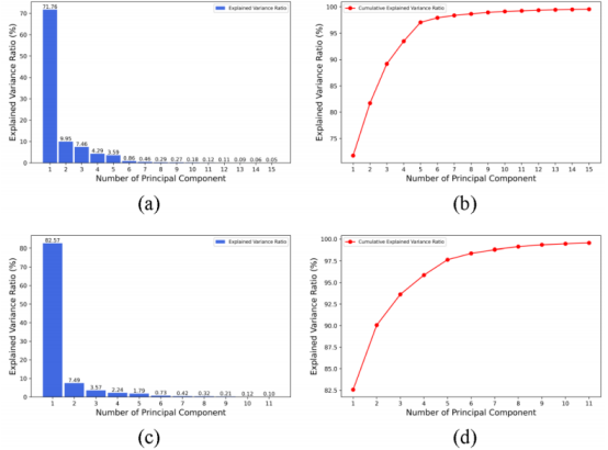 图7(a)部分面积归一化之后的前 11 个主成分数据解释率;(b)部分面积归一化之后的前 11 个主成分累积数据解释率;(c)总面积归一化之后的前 15 个主成分数据解释率;(d)总面积归一化之后的前 15 个主成分累积数据解释率