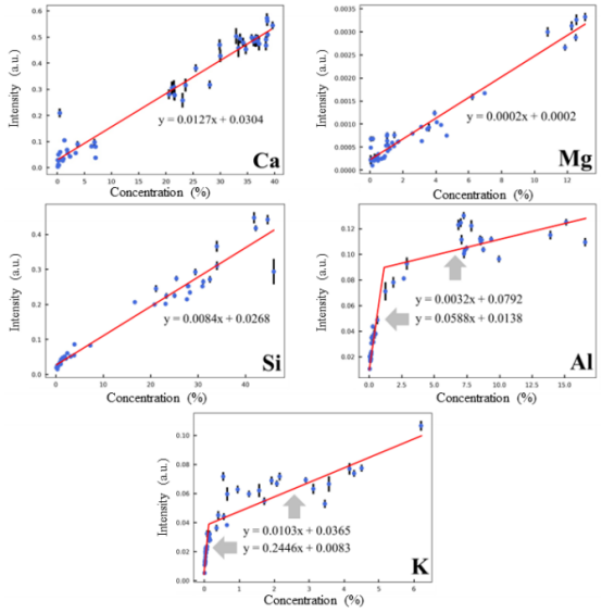 如上图所示,这些主成分已经可以代表训练集光谱数据中绝大部分的信息。以主成分为自变量,校正系数为应变量,采用 PCR 算法建立了计算校正系数的模型。通过所建的 PCR 模型计算出峰强的校正系数再乘以归一化之后的峰强得到校正后的峰强,基于此建立 Mg、Si、Al 和 K 元素的定量分析模。五个目标元素最终的定量分析模型如图8 所示。