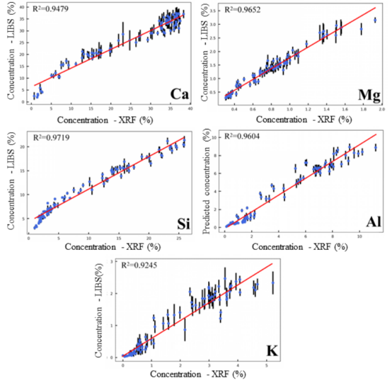 传统的元素分析技术主要包括中子活化法(NAA)、原子吸收光谱法(AAS)、电感耦合等离子体发射光谱法(ICP-AES)、电感耦合等离子体质谱法(ICP-MS)等。作为一种新兴的原子发射光谱分析技术,激光诱导击穿光谱(LIBS)技术具有样品前处理简单、结构简单易于小型化、可同时检测多种元素、分析速度快等优点,已经被广泛应用于食品、合金、爆炸物、土壤等多种物质的分析。在本章工作中,将针对岩石中 Si、Al、Ca、Mg 和 K 五种主量元素,为该仪器开发配套的元素定量分析方法,以满足录井现场对岩屑样品进行元素分析的实际需求。最后将 LIBS 的检测值与目前录井岩屑元素分析应用最为广泛的 XRF 技术的检测值进行对比来评估其现场应用的可行性。