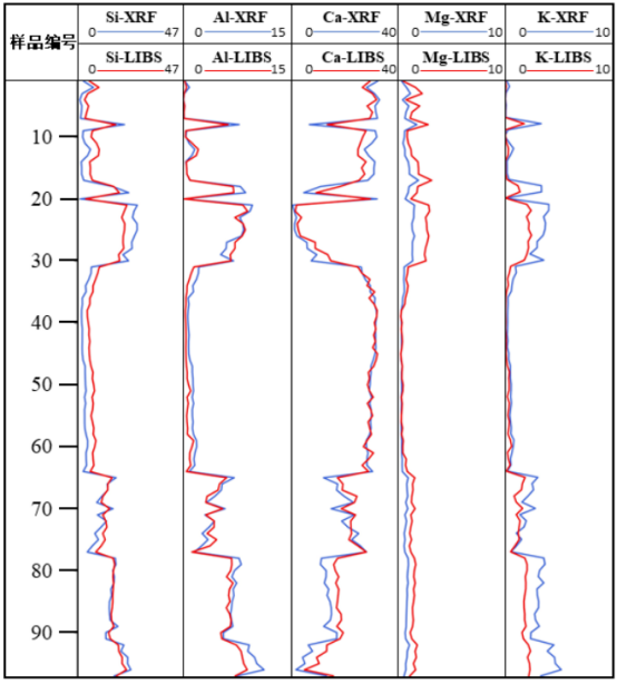 根据应用测试的结果,绘制了目标元素含量变化的趋势图,如图11 所示。图中红色的曲线代表 LIBS 仪器的检测结果,蓝色的曲线代表 XRF 仪器的检测结果,两根曲线的整体变化趋势是一致的。