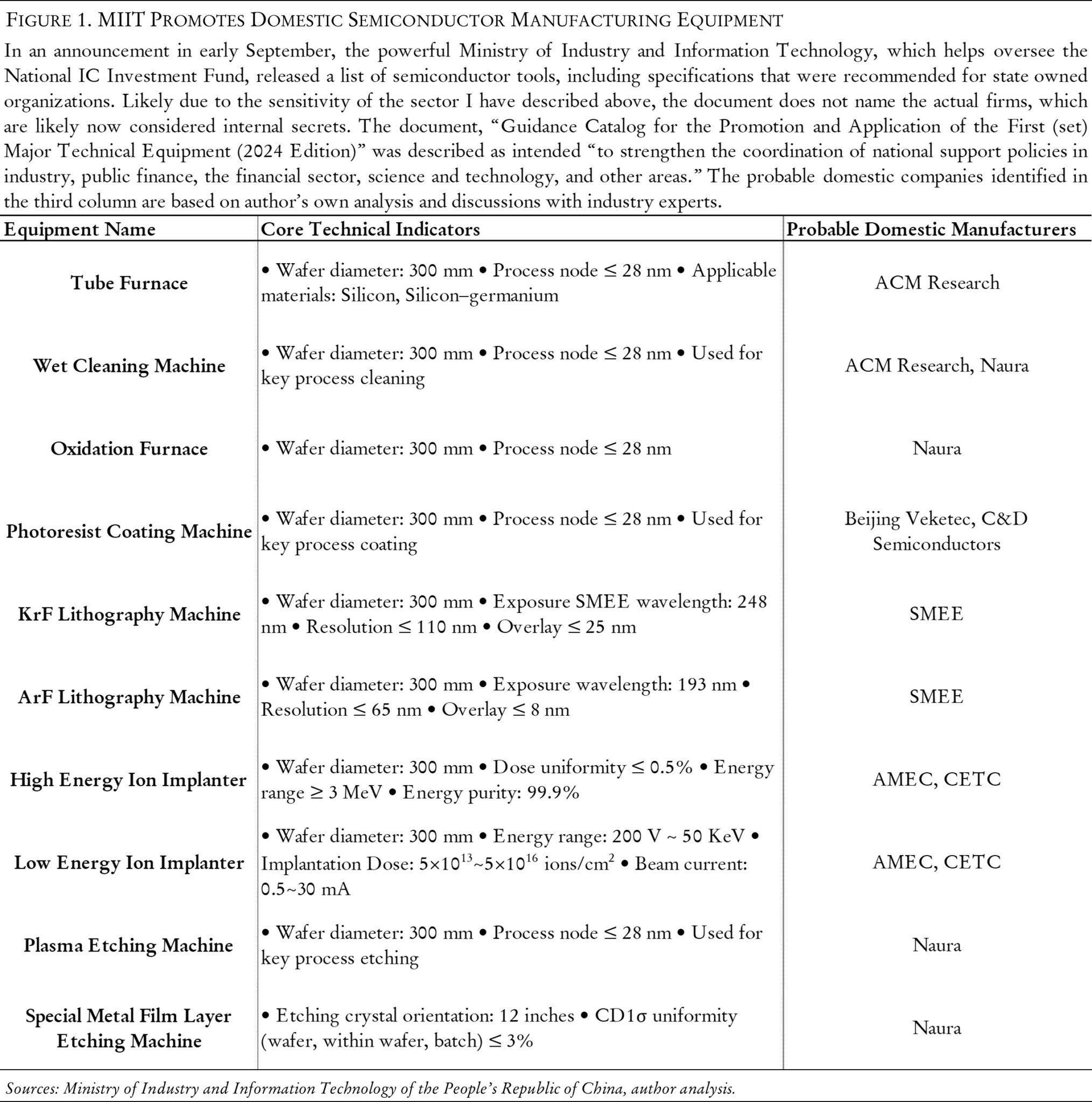 其他主要参与者专注于先进光刻工艺的其他组成部分。2024 年 9 月,工信部发布了一份重要的报告,重点介绍了涉及其他关键工艺领域的技术,但不包括公司,例如湿洗、光刻胶涂布机、离子注入和等离子蚀刻。下表列出了工信部发行版隐含的几家公司。鉴于所有这些领域的技术进步话题的敏感性,工信部发布似乎不太可能包括在华为的支持下在中国各地的工厂以及使用国产工具试产线的先进设施中所做的任何工作。