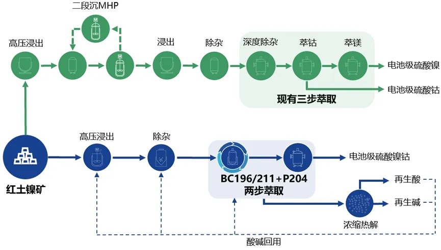 红土镍矿现有的湿法冶炼工艺已基本成熟,当前工艺下已难以实现成本的压缩,而依托BC196/211系列红土镍矿专用萃取体系独特的分离特性和对硝酸、硫酸、盐酸优异的耐受性,开发的新技术可以进一步大幅降低镍钴的冶炼成本,实现利润的提高,通过技术革新突围行业内卷。