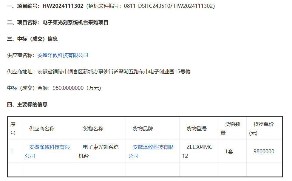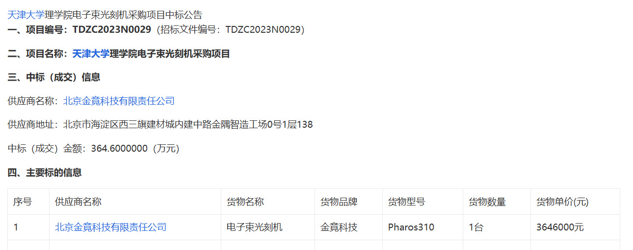 通过【微纳视界】招投标信息查询得知,近期国内多个电子束光刻机招标项目,中标方为国内企业。其中北京金竟科技有限责任公司成功中标太原理工大学和北京大学的电子束曝光机项目;安徽泽攸科技有限公司则中标复旦大学电子束光刻系统机台采购项目,是该公司首个电子束光刻机公开中标项目。公开信息显示,北京金竟科技有限责任公司在2023年8月,中标天津大学理学院电子束光刻机采购项目,这是国内电子束光刻机首次公开中标。