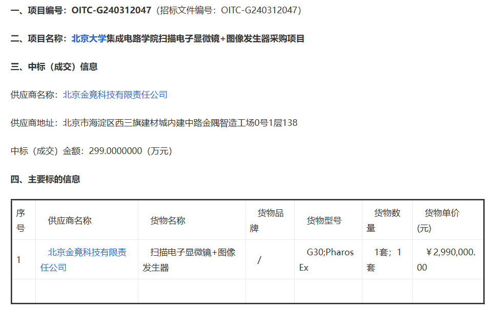 【中标】北京大学集成电路学院扫描电子显微镜+图像发生器采购项目