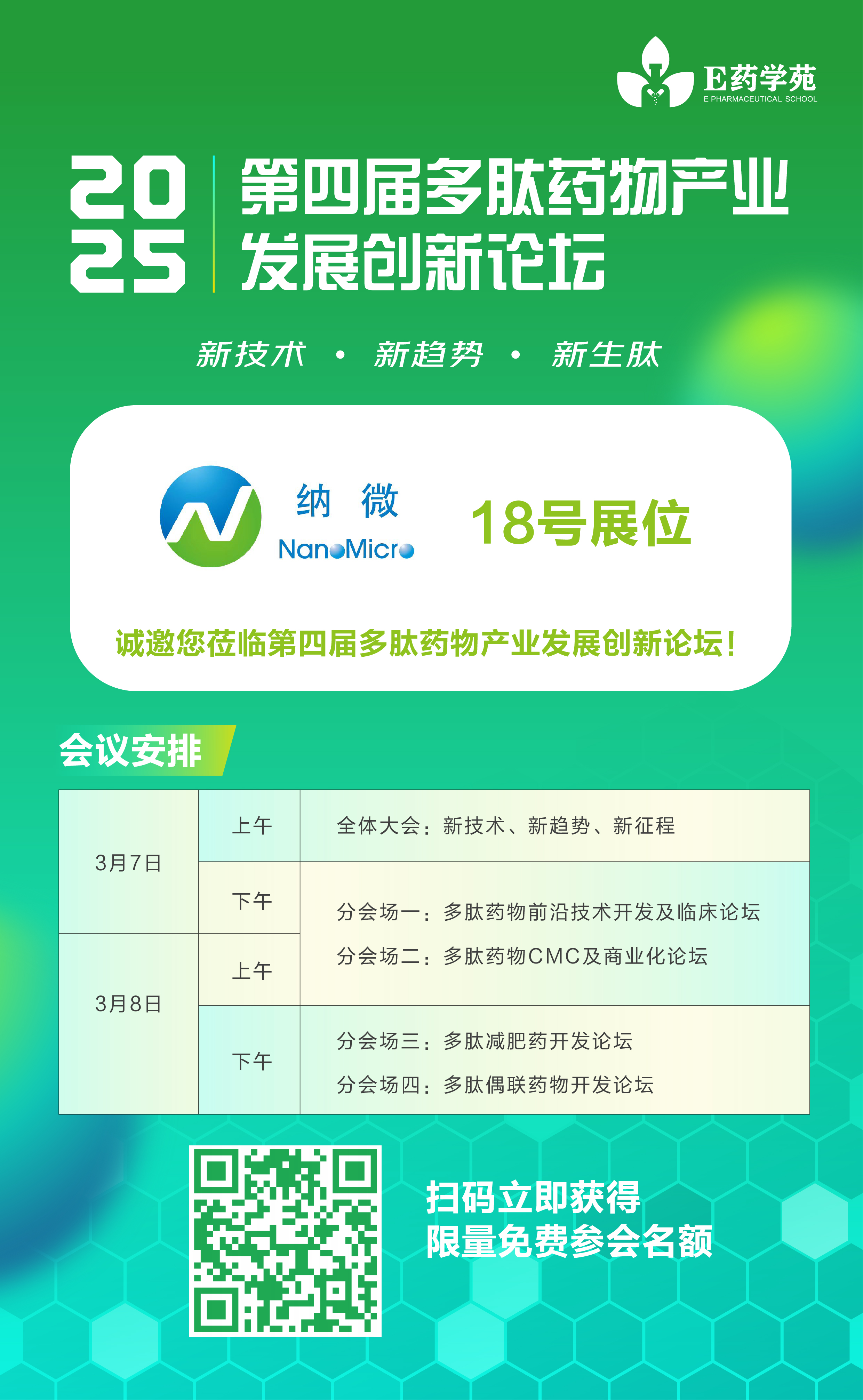 2025年3月7日-8日,第四届多肽药物产业发展创新论坛将于苏州举办。本届论坛将聚焦GLP-1、PDC、环肽等热门领域,涵盖多肽药物前沿技术、临床试验、CMC等板块,围绕“新技术、新趋势、新生肽”的大会主题,为相关领域的专家及科研人员提供一个深度的多肽药物的思想碰撞及经验分享平台。