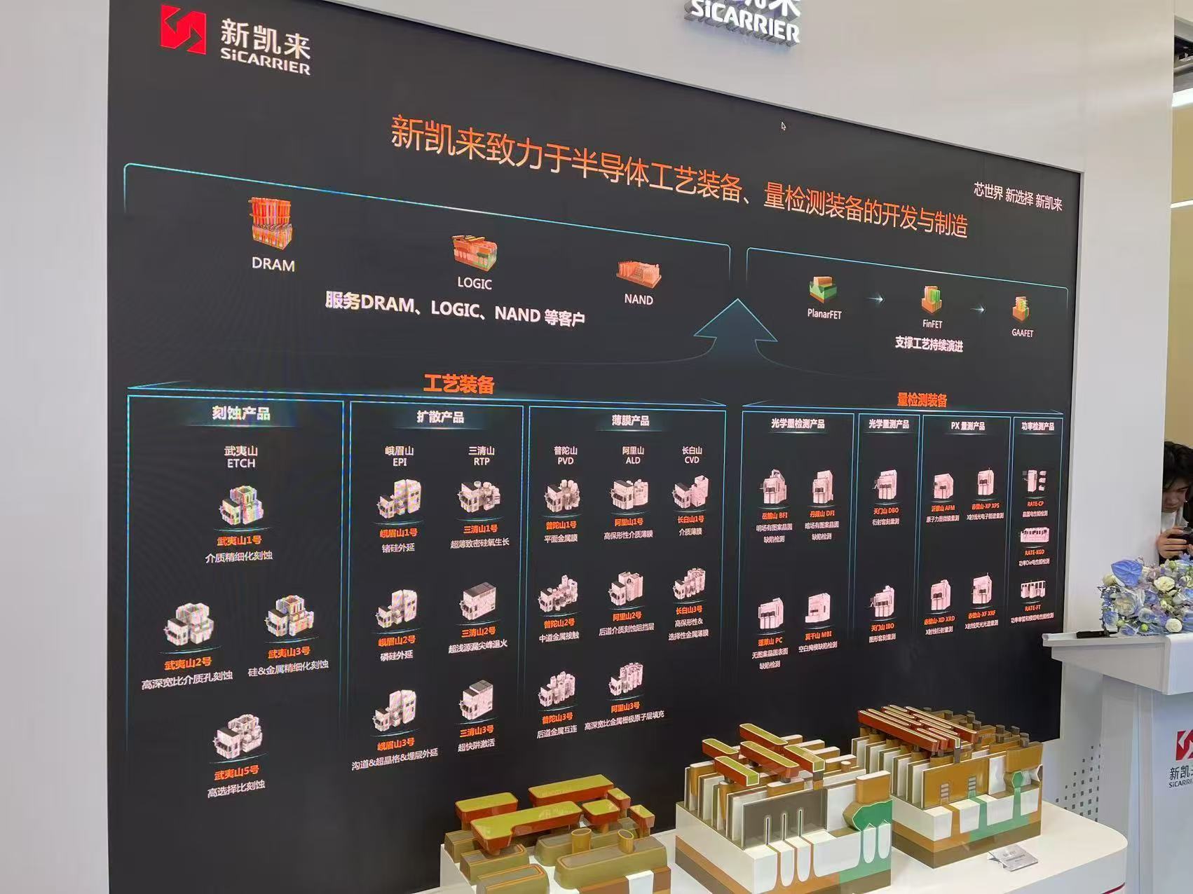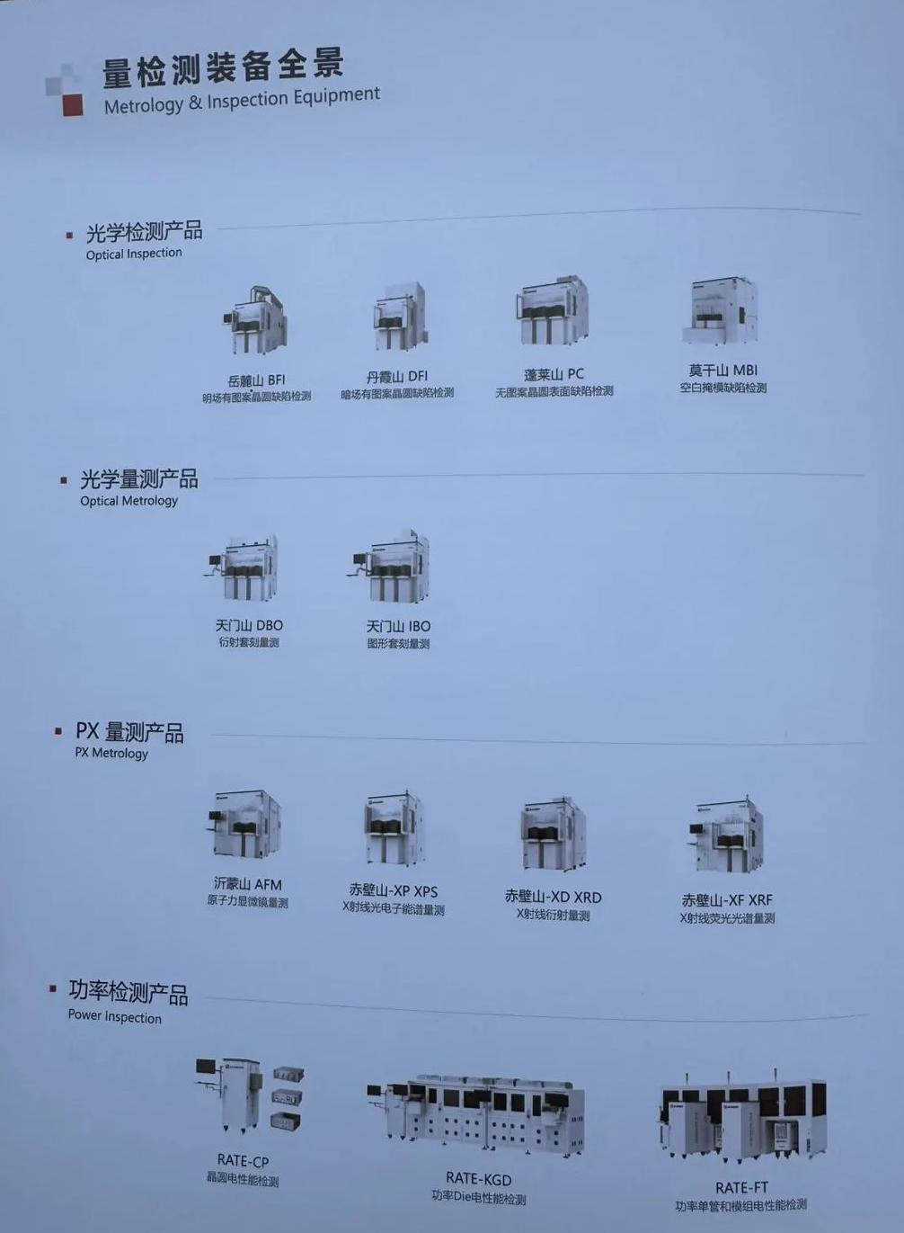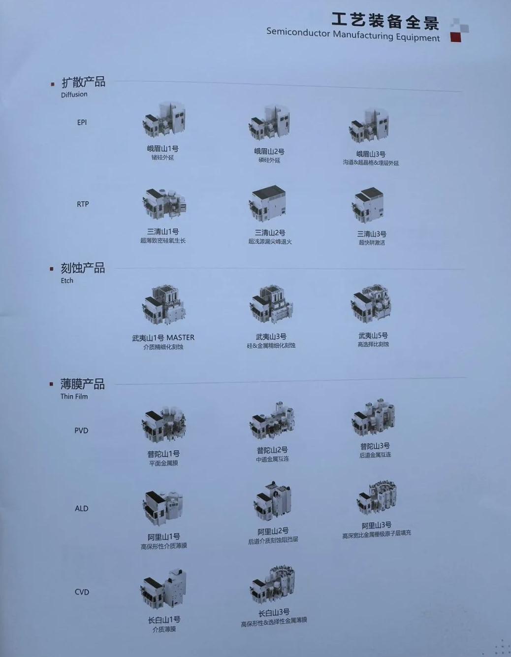 据展会现场报道,新凯来此次公开发布的半导体装备分为工艺装备和量检测装备两大类,以“峨眉山”“三清山”“武夷山”“普陀山”“阿里山”等中国名山命名,覆盖半导体制造中的扩散、薄膜沉积、蚀刻、量检测等核心环节。据现场披露,这些设备在精度、效率和智能化水平上均达到国际先进标准。