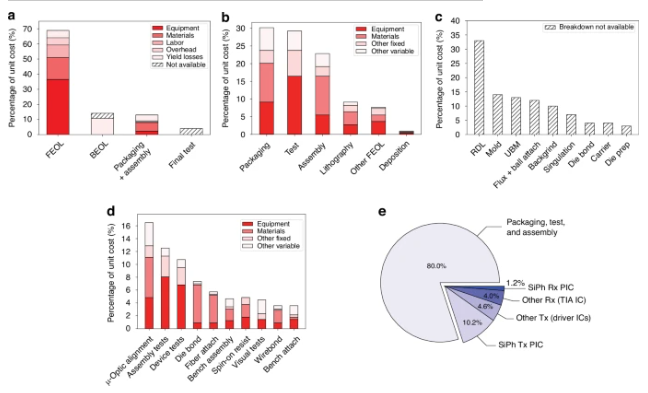 最后,(e)提供了普遍电子光子系统——SiPh收发器的整体成本分解8。
