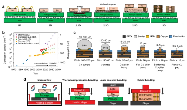 目前,先进的电子封装通常由先进节点电子芯片接地到再分配层(RDL)或嵌入式桥接(称为2.1D架构)组成,这些桥接器制造在有机封装基板上;或由硅中介体粘接的芯片组成,硅中介体再结合有机封装基底(根据中介层是否足够厚以支持电气通孔,称为2.3D或2.5D架构)29.通常,添加RDL、桥接器或中介层的目的是为了在封装内实现更高的电气扇出——这些元件上没有功能性器件,只有Cu线路或通孔。扇出本身是通过向封装堆栈中推移时,凸起技术的缩放实现的,晶块到中间介层的Cu柱凸起间距为<20微米,而封装基板与板板之间的C4连接间距为>100微米30.将电晶堆叠(全三维架构),这是先进动态随机存取存储器(DRAM)芯片封装中常见的做法31以及互补金属氧化物半导体(CMOS)图像传感器32也有可能。这些三维架构针对连接密度>104每毫米的连接数2以及通过通过硅孔(TSVs)结合混合键合实现凸起间距<10微米33,下面将详细说明。