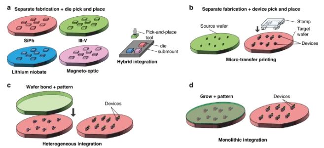在(a)中,展示了几个材料平台PIC的混合键合。这些不同材料平台的设备也可以通过其他选置方法(如(b)中的 μ-TP 进行集成。器件也可以通过晶圆键合(即异相集成)在有限元素外侧(如(c)或外延生长(即单晶集成)集成(如(d))进行集成)