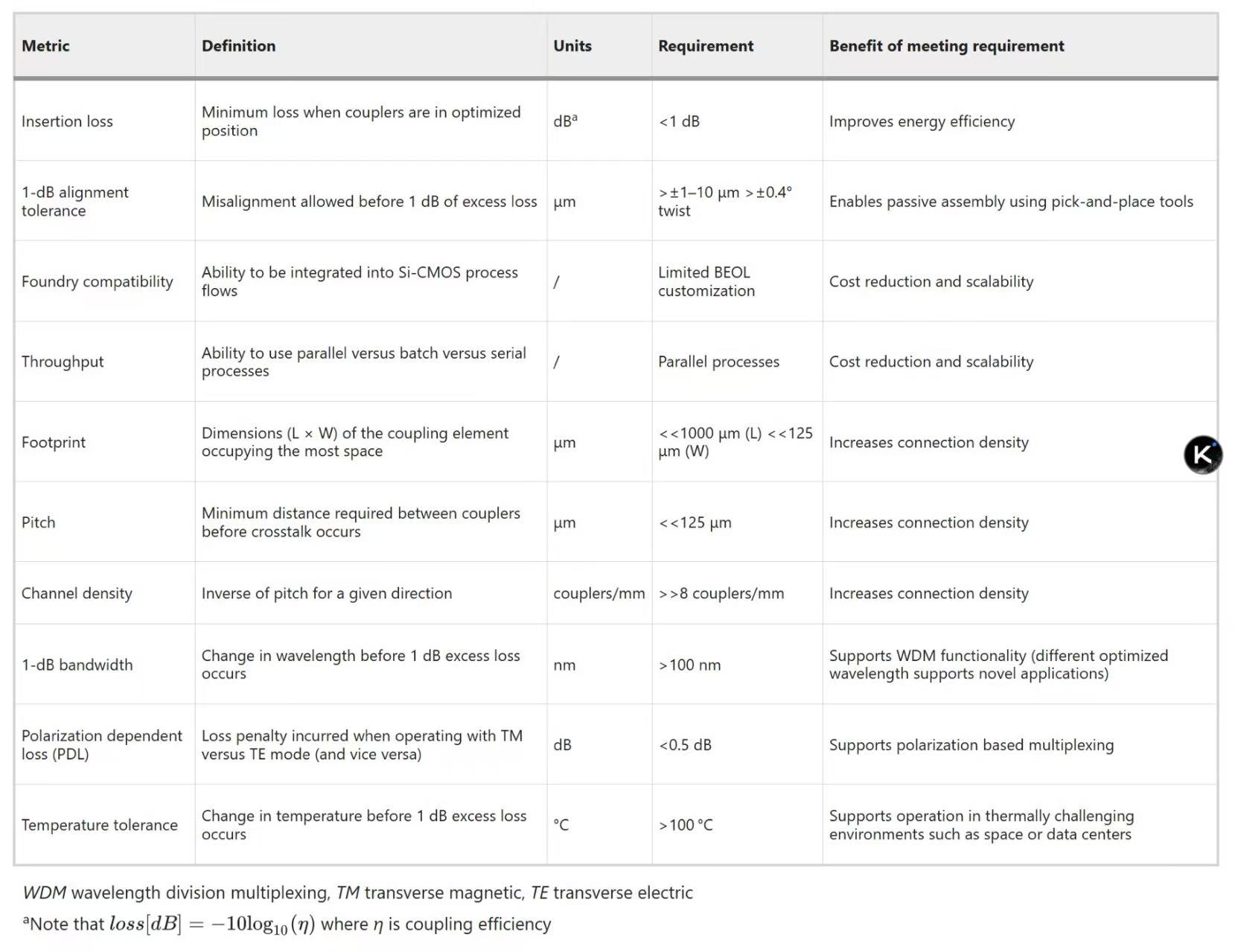 首先,这里讨论的芯片间或翻转芯片光学耦合器能够消除光纤到芯片接口及其相关的制造挑战和低效。这在两个方面很重要:连接密度(即总带宽)和成本。在连接密度方面,芯片间光耦合器突破了SMF阵列标准125微米包覆所限制的每毫米8连接障碍,允许连接密度超过每毫米100个连接——提升了一个数量级以上。能够并行扩展光子封装连接数,提供了另一种向量,用于增加总封装带宽,同时还包括波长每通道、偏振、比特率和光模式的缩放。另一个影响是光子封装制造成本——将芯片间光耦合器取代光纤对芯片接口,可以被动使用自动拣选和放置工具,而非主动对准和组装,从而提高吞吐量并降低成本。