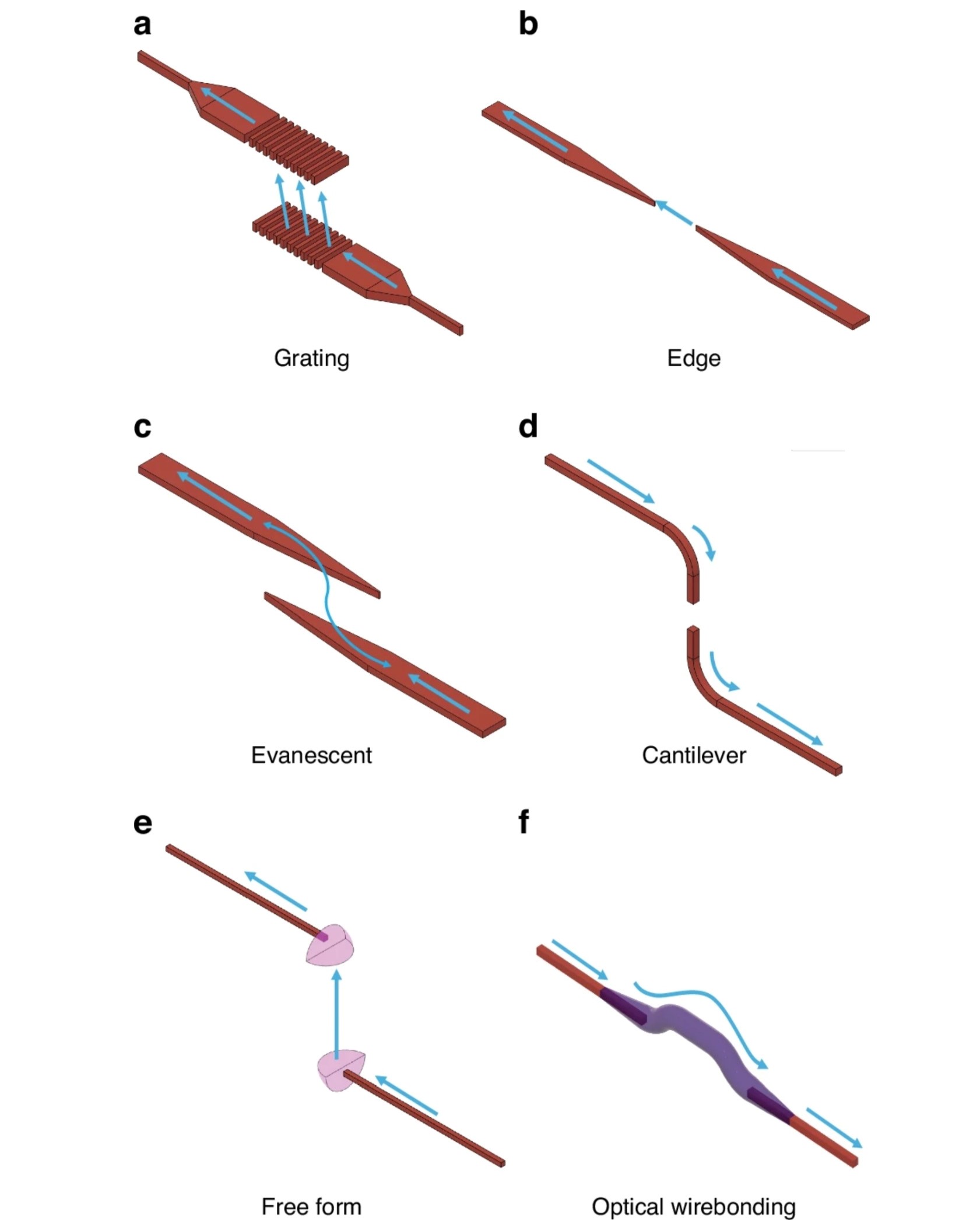 这些芯片间连接的设计理想情况下应符合表1中提出的要求,以便在实际应用中有用,并优于光纤到芯片封装。这些性能指标将作为这些芯片间耦合器比较的基础,并作为未来比较的起点。以下部分将讨论不同类型的芯片间光学耦合器及其工作原理。