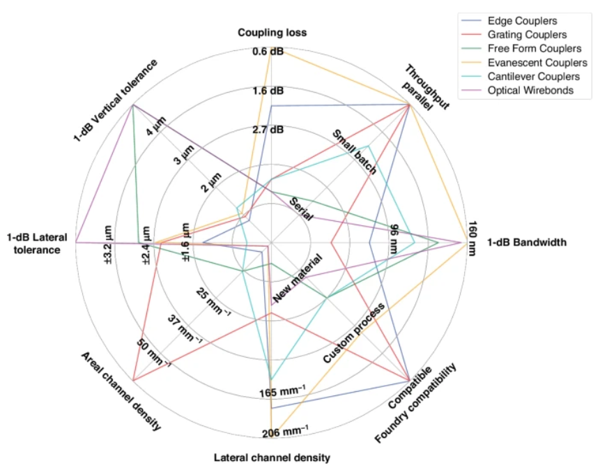 文献中提出的芯片间耦合光学耦合设计可分为六种类型:边缘、光栅、自由形、消逝式、悬臂和光线键。这六种类型的基本工作原理图可见图。5. 此外,图。6 显示了每个优点指标和每种耦合类型的数值,定义见“引言”。图中显示的每个功绩指标的数值。6 是对表 2–8 中每个数据点的平均值。在吞吐量和代工兼容性指标方面,每种偶联类型均基于所用制造、封装和组装工艺(例如标准193/248纳米深紫外光刻与定制双光子聚合)及所需材料进行定性评估。图中的情节。6 可以作为后续章节的参考,展示耦合类型之间的比较以及哪种最适合不同应用。其余部分描述了每种联结器类型的工作原理,提供了著名设计和结果的示例,并呈现了对每个联轴器进行定量比较的表格。