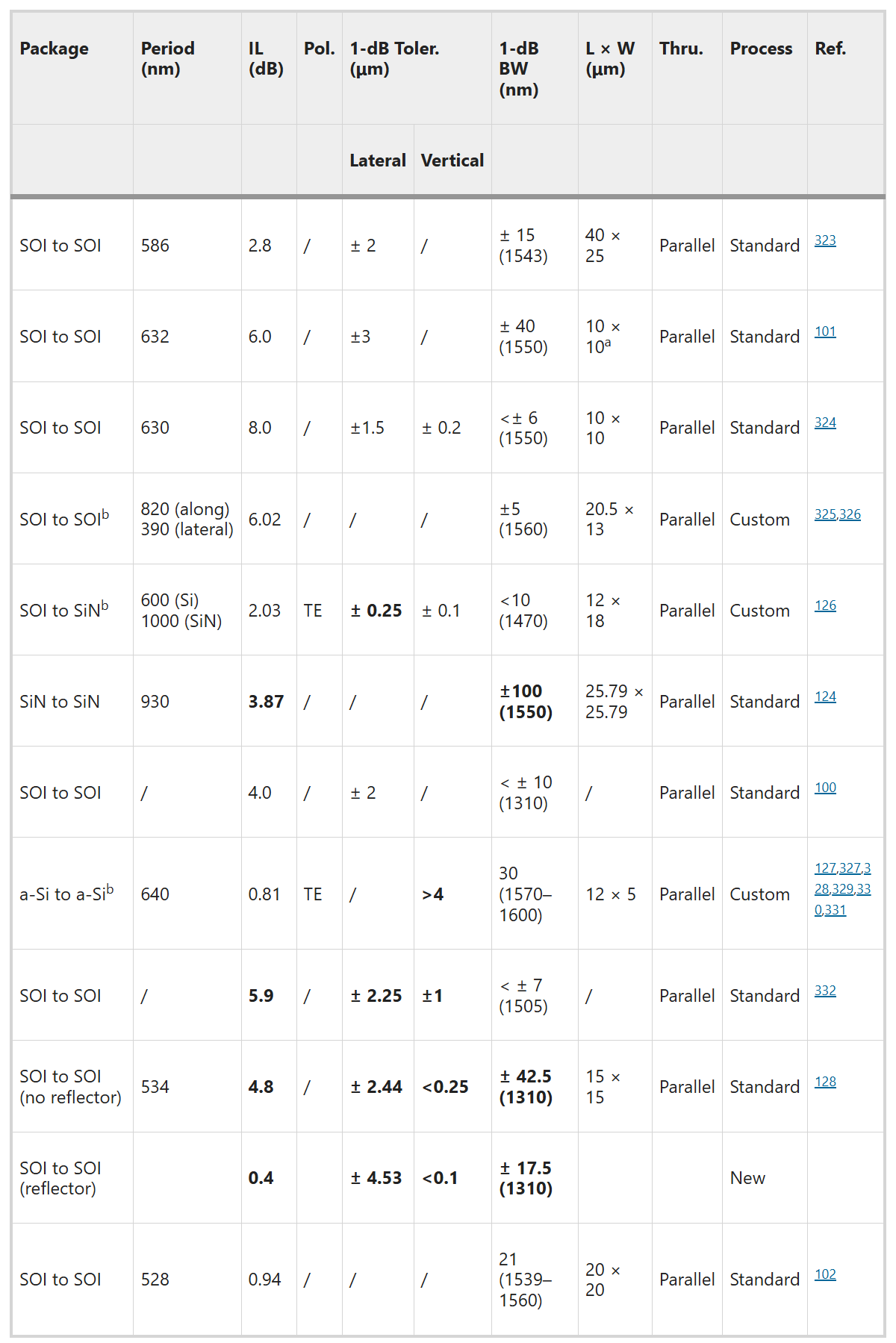 总之,边缘耦合器用于芯片间连接有许多优势。边缘耦合器可在宽波长窗口内实现<1 dB的损耗,且具有偏振独立性,代工厂将低损耗边缘耦合器作为标准工艺设计套件(PDK)组件96.然而,它们在传播方向上的足迹更大,因为绝热锥形(MMI)可以延伸>1毫米9,76,78,88,91,以及低错位容忍度,且因基底泄漏风险而加剧。它们必须位于边缘且具有高质量面,这也使得它们无法用于二维阵列,从而限制了其I/O密度。