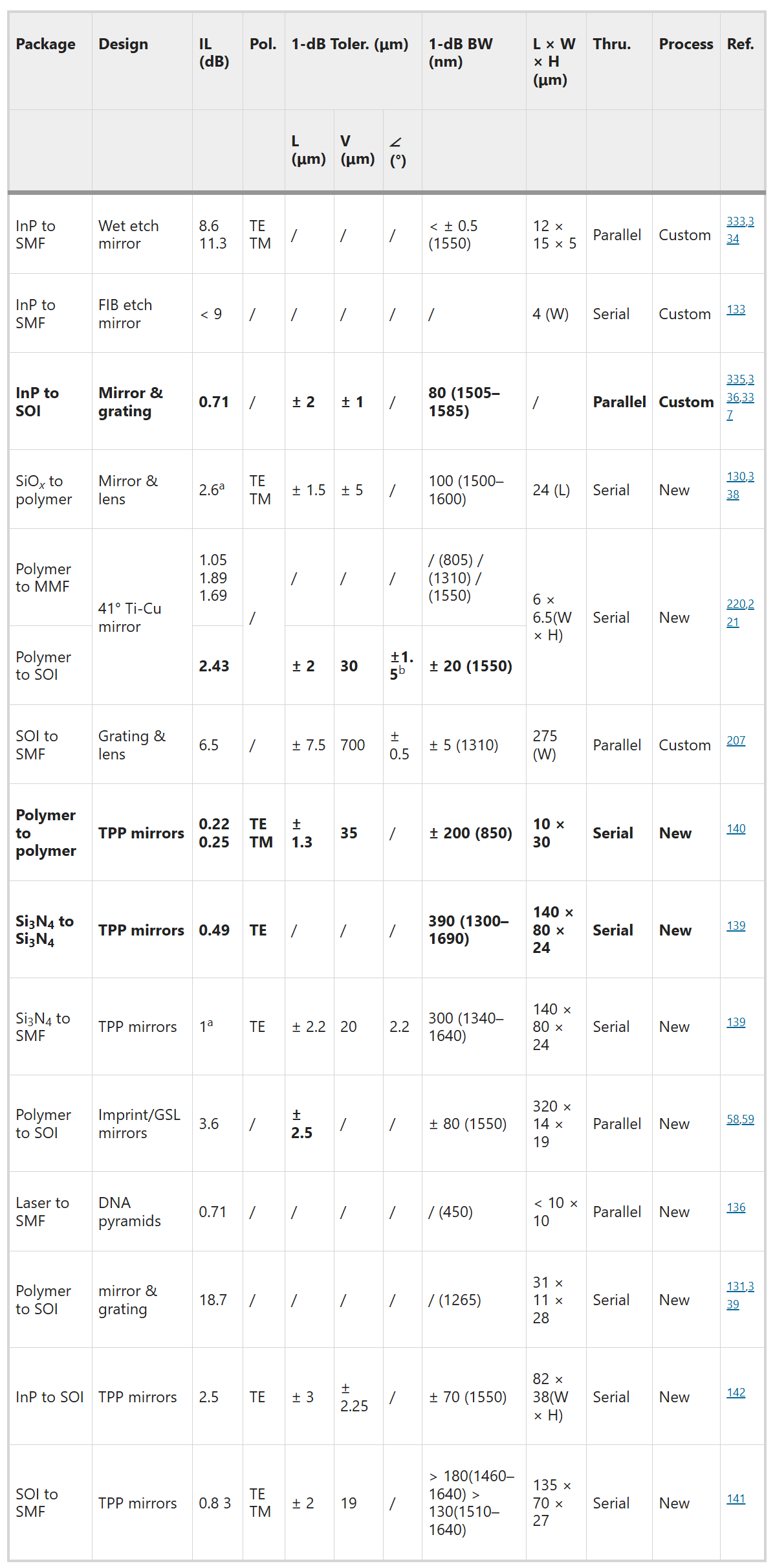 使用镜子和透镜的一个重要优势是它们具有低波长和偏振灵敏度。这可从表4中1 dB带宽和插入损耗列中看到,显示带宽>±200 nm,以及可见光(805 nm)和数据通信/电信区间(1310/1550 nm)的工作。自由形耦合器的纵向覆盖面积也较小,约为<50微米,尽管实际中由于Si或SiN中的绝热锥形,这一尺寸通常更大x波导需要用于增加MFD59,139 . 另一个优点是垂直对准公差可扩展至>35微米,便于与电气互连集成。侧向对准公差同样可以通过增加镜面尺寸及增大准直光束的磁流远距来扩大。当然,增大镜面直径限制了侧向通道密度,这对于需要连接密度>50 mm/mm的应用来说是权衡。虽然此类微光学元件的热容性需要谨慎考虑,因为它们通常由低玻璃转变温度的高分子制成,但可以使用能够承受高达250°C回流温度的树脂是可行的139.