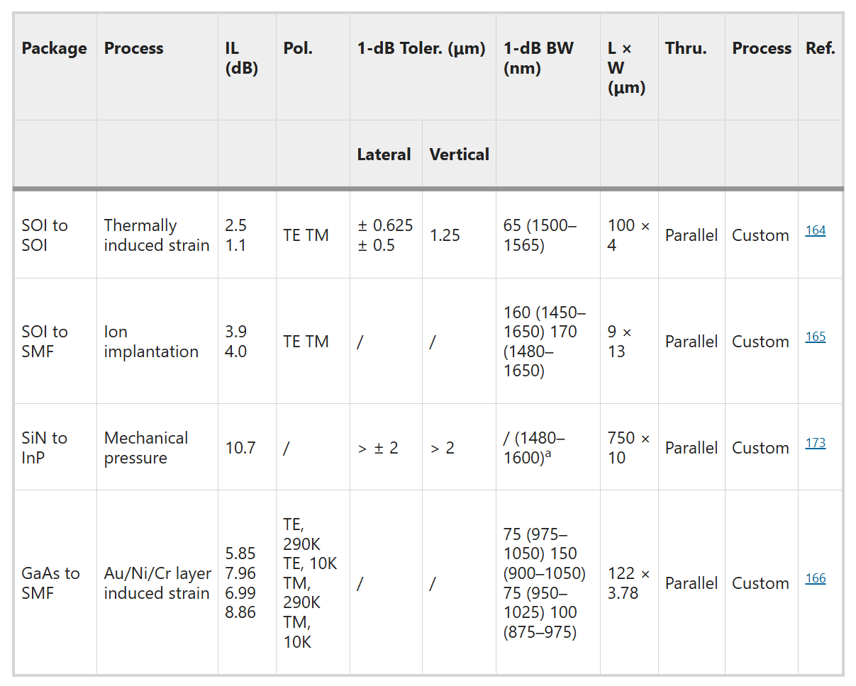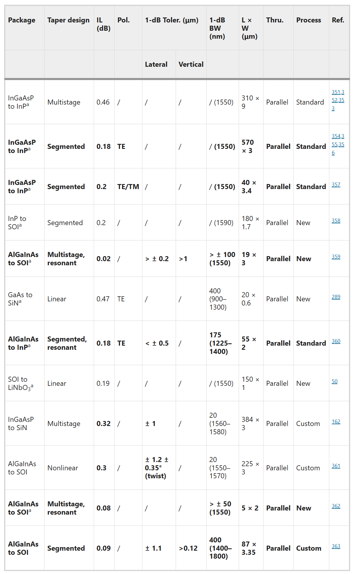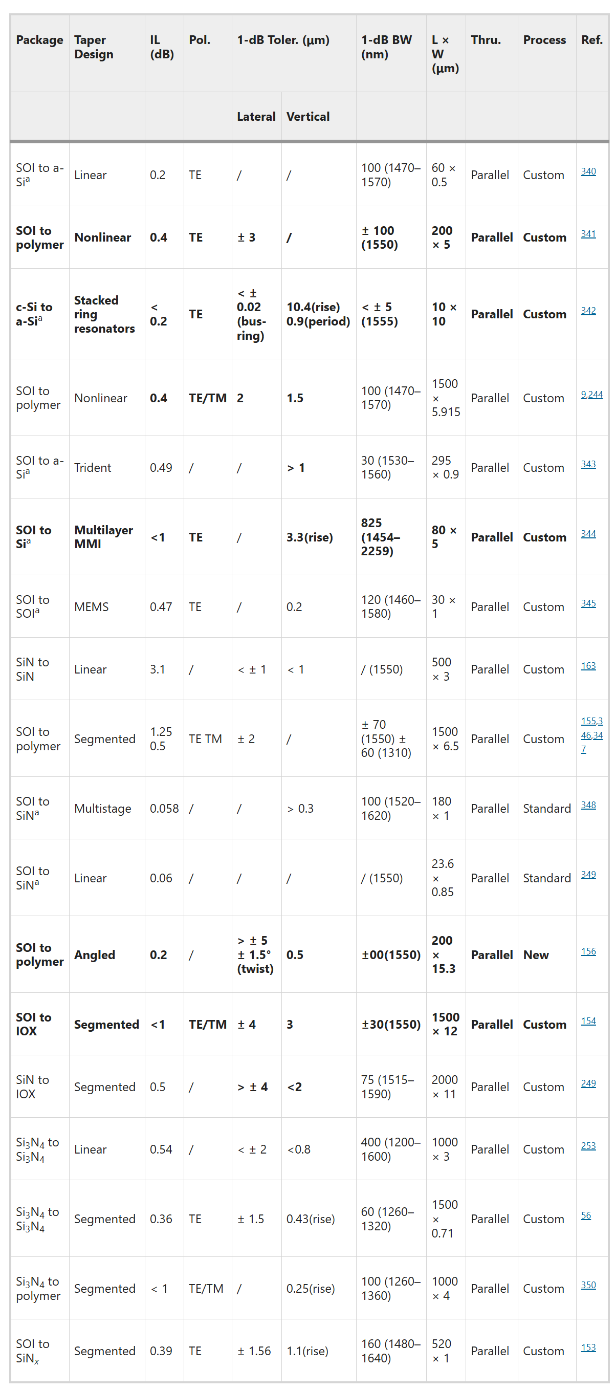 此外,消逝耦合器也被用于III-V到III-V或III-V-到Si-PIC连接,用于SOA、激光器或调制器集成。该领域已有扎实的文献基础描述典型的制造工艺158,159,160,161通常涉及III-V型硅氧烷-双苯并环丁烯(DVS-BCB)晶圆键合至图案化硅,再进行III-V型图案化,或使用DVS-BCB键合对先前图案化器件进行微转印打印。表6比较了使用晶圆键合或微转印印刷器件的不同消逝耦合器设计,其中许多采用与硅消逝耦合器相似的几何形状。垂直对齐公差通常不报告,但DVS-BCB层厚度通常为<100纳米。III-V型器件中更常见的设计是多级耦合器,利用多层叠加信号传输,这种技术在两个波导间折射率差较大或需要克服大垂直间隙时非常有用。例如,参考文献中。162三级耦合器设计用于将InP波导连接到硅3N4其指率差约为1.3–1.5。参考文献中也使用了多级消逝耦合器。163用于耦合输入Si之间的光3N4中间波导和SOI芯片波导,使用硅3N4输入层和输出层之间的波导。这种多级设计可以通过在BEOL中部放置锥形结构作为中间层,来克服厚重的BEOL层。