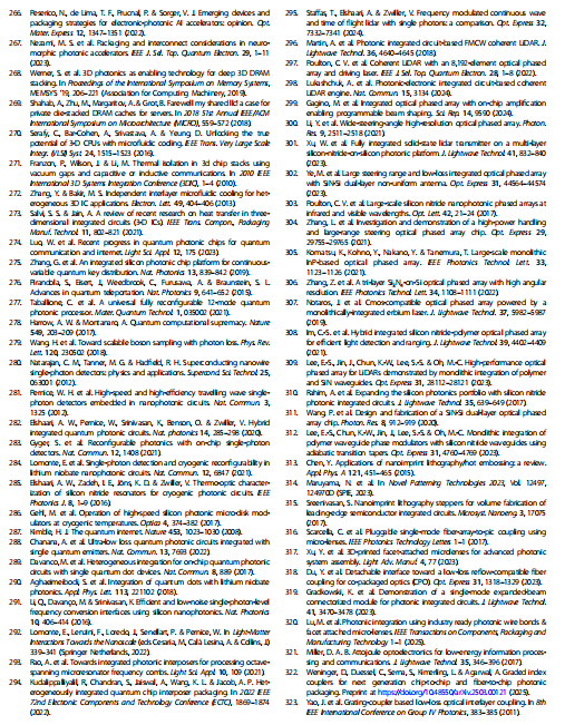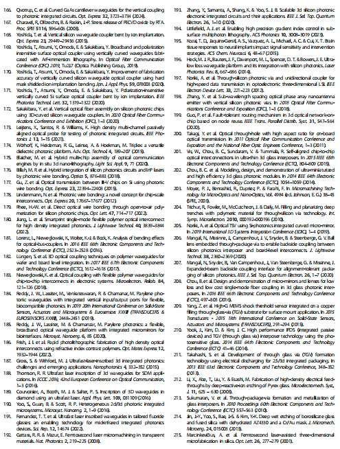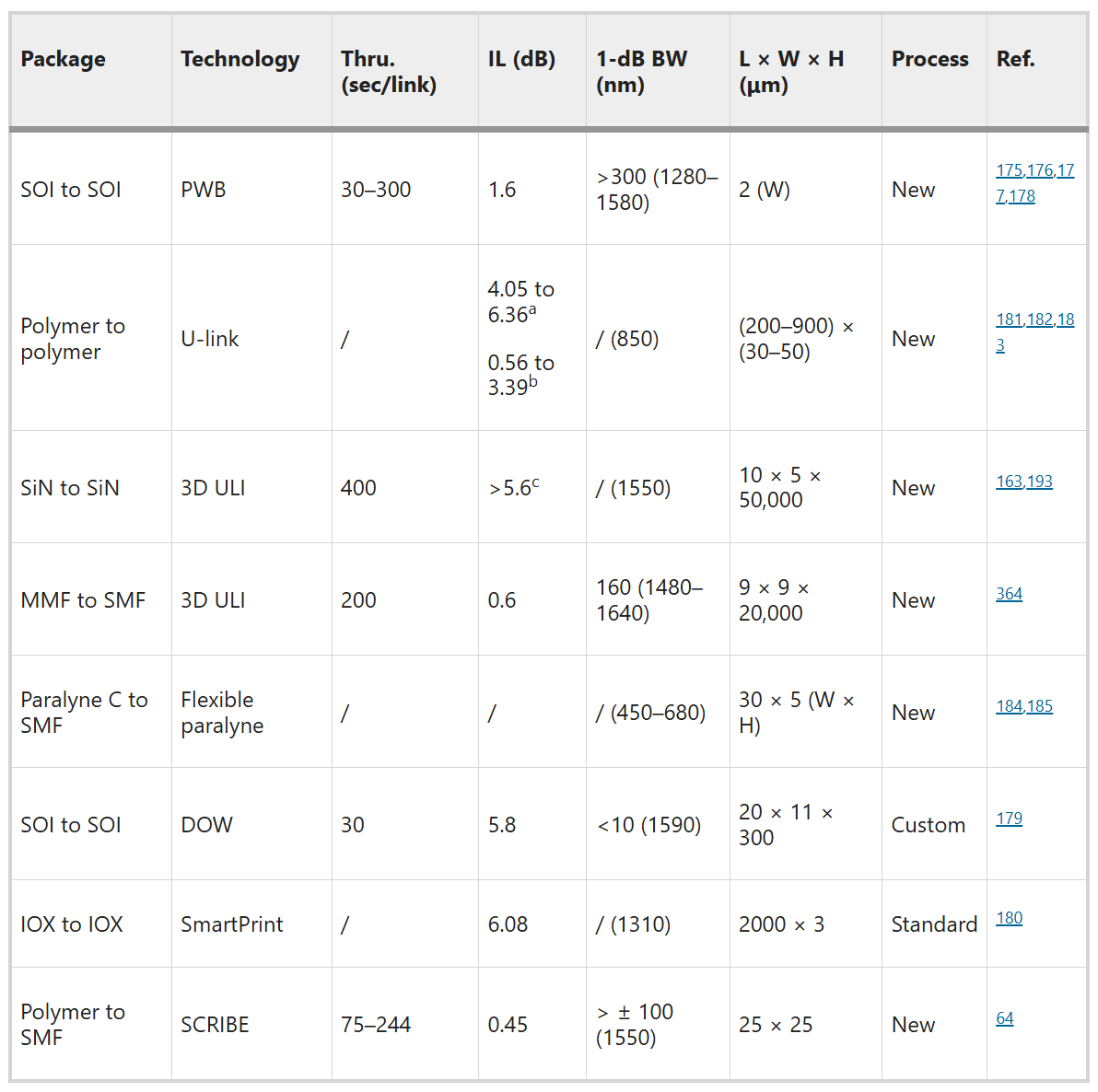 尽管如此,LIC系统仍适合与SMF阵列实现低损耗接口,提供低传播损耗以实现光学再分配,并实现制造成熟度。例如,参考文献中。154,IOX在玻璃上的平台展示了平均0.68 dB的插入损耗和0.1 dB/cm的传播损耗,参考文献中。155柔性聚合物波导在1310 nm(850 nm)处插入损耗为0.3 dB(2.2 dB),在1310 nm(850 nm)处传播损耗为0.4 dB/cm(0.05 dB/cm) 155,157.因为这些结构也使用了与铸造厂兼容的材料制造和测试,包括含硅氧烷基聚合物的回流兼容层压板155且可在面板层面制造,非常适合在封装层进行光散开后,在板上实现光学连接和再分配——这是未来三维光子封装技术难以解决的挑战。