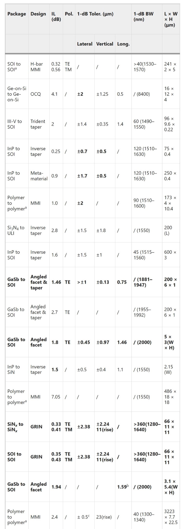 总之,正如表5和表6的结果所示,消逝式芯片间耦合器在带宽>100 nm和横向通道密度>100耦合器/毫米)下,能够实现<0.5 dB的超低耦合损耗。这些优势可以在使用与铸造厂兼容的工艺时实现,并通过优化锥形设计实现微米级的对准公差,从而实现自动拣选安装。消逝式联结器还存在一些未来设计改进的挑战。首先,由于它们依赖于消逝尾部分布,通常依赖极化。此外,虽然通过锥形设计可以最小化纵向占地面积,但由于绝热性的需求,这些耦合器通常仍具有>100微米的纵向占地面积。最后,虽然多级锥度设计可以有效增加垂直锥度间隙,但这些设计仍需在BEOL层内额外制造波导,增加了制造复杂度。