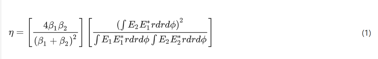 有效耦合的具体理论最终取决于耦合设计;然而,一些常见的关系可以传达相关趋势。为了实现高效且容配的耦合,入射模和透射模必须尺寸和形状匹配,反射和错位应尽量减少。这些因素的影响可以通过两个重叠模式间耦合效率(η)方程来观察65: