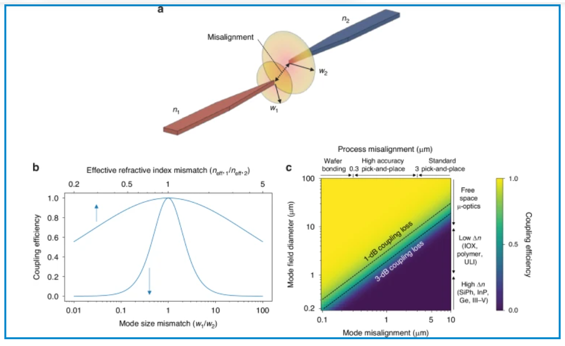 我们可以数值求解积分以获得洞见。结果如图所示。7b 显示了模态大小不匹配(w1/w2)和反射(即有效折射率不匹配 nEFF,1/nEFF,2降低耦合效率,尺寸不匹配起更重要的作用。同样,图。7c 强调模态错位如何影响耦合效率,同时展示了不同制片工艺(如晶圆键合机、高精度选位刀具和超高速选位刀具)常见的错位规模。注意,光刻中的覆盖错位不会被绘制出来,因为误差通常小于临界尺寸的三分之一(例如,对于90纳米的节点工艺,误差小于30纳米)66,因此可以假设其尺寸小于50纳米。有趣的是,对称地增加入射和透射模的模场直径(MFD)可以提高比准容差。如图所示,MFD的提升可以通过切换到允许低折射率对比(Δn)的材料平台实现,比如玻璃或聚合物芯/包壳上的离子交换波导(IOX),以增加消逝场大小。从高Δn材料平台如SiPh或InP的代价是需要更大的波导音高(以容纳更大的MFD)以及更大的弯曲半径以保持芯片间低损耗布线——这两者都会显著影响电路的连接密度。这种权衡——既希望更大的MFD以增加芯片组装的对准容差,又需要更小的MFD以增加连接和器件密度——是光子封装中最关键的因素之一。在接下来的章节中,将介绍每个耦合类关键的额外关系,并强调每种耦合类型都必须在某种层面存在模态重叠。
