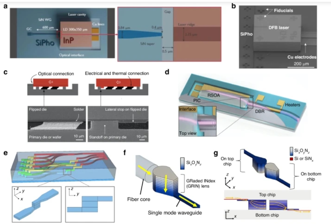 在(a)和(b)中,分别展示了从SiN波导到InP DFB激光器使用拾取与放置工具被动组装的反锥形边缘耦合器的示意图和实验图像(经参考文献许可转载)。75©2023年IEEE数据。在(c)中,展示了InP与SOI耦合的侧面视图,其中红色矩形是InP模具,灰色蚀刻形状是SOI模具。横跨InP和SOI的黑线表示两个表面的波导耦合。底部展示了侧视图的实验显微镜图像,展示了利用机械止挡实现亚微米三维对准(转载自参考文献)。372, ©2018 T. Barwicz 等人,获得爱思唯尔许可,并依据 CC BY-NC-ND 4.0 授权)。在(d)中,展示了基于翻转芯片GaSb放大器和SOI波导的混合DBR激光器48(©2022 N. Zia 等,依据 CC BY 4.0 许可)。在(e)中,利用MMI器件实现聚合物波导层之间的耦合92(©2024年,M. Weigel等,依CC BY 4.0授权)。在(f, g)中,SOI对SOI或SiNx致SiNx使用集成GRIN透镜的翻转芯片耦合322(©2025 D. Weninger 等,CC BY 4.0 许可)