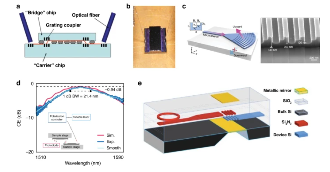a, b 采用In bump自对准的光栅对光栅耦合器(经参考文献许可转载)。101©美国光学学会)。c, d L形光栅用于拓扑单向共振,芯片间波长响应102(©2024 H. Wang 等,CC BY 4.0 许可)。在(e)中,SOI到Si3N4片内光栅耦合器使用上下反射器(经参考文献许可转载)。126©美国光学学会)