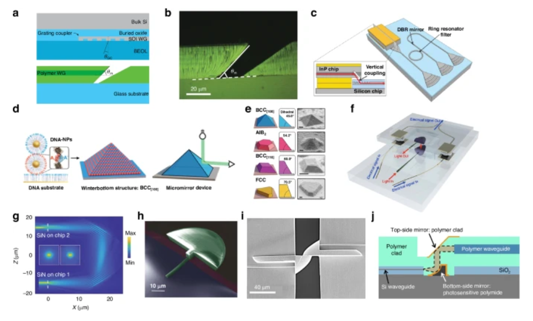 在(a, b)中,聚合物波导中的45° TIR镜面用于耦合芯片上的SOI光栅(参考文献中转载)。131,经AIP出版社许可)。在(c)中,InP的TIR镜和选择放置InP模具之间的SOI光栅耦合灯的组合(经参考文献许可转载)。335©美国光学学会)。d、e DNA 自组装金字塔(经参考文献许可转载)136,©2023年美国化学学会)。在(d)中,DNA形成可用作平面外反射体的多面结构的示意图。在(e)中,SEM图像展示了在自组装过程中如何控制面角。在(f, g)中,展示了使用TPP制造微反射器的翻转芯片耦合器的原理图和仿真数据139(©2023年S. Yu等,依CC BY-NC-ND 4.0授权)。在(h)中,展示了用于光纤与PIC耦合的反射器实验图像(经参考文献许可改编)。141©2024年中国激光出版社)。在(i)中,一张SEM图像展示了TPP制造的微反射器连接两个未翻转芯片、而是并排放置的独立芯片142(©2024年黄宇,CC BY 4.0授权)。在(j)中,展示了使用灰度和NIL制造的联结器的侧面视图58(©2022年,Nakamura等,依CC BY 4.0授权)