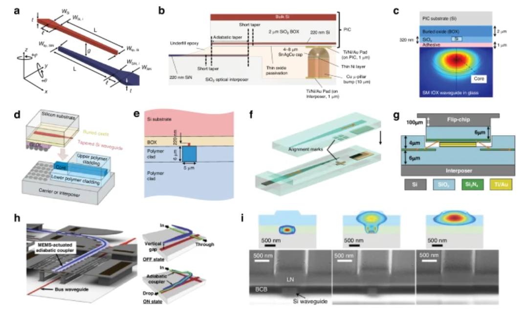 a, b SiN 在熔融硅上与 SOI PIC 上(经参考文献许可转载)。152,©Optica 出版集团)。在(a)中,耦合器的透视视图,红色表示SOI PIC上的双锥度,蓝色表示石英介体上的SiN双锥度。在(b)中,展示了铜微柱凸起的电子-光子积分,以及使用底填充环氧树脂实现机械稳定性和折射率匹配的侧视图。在(c)中,展示了IOX波导到SOI波导消逝耦合器沿传播方向的截面(经参考文献许可转载)。154©2020年IEEE数据)。d, e聚合物波导板安装至SOI PIC上。(d)中,是耦合器的透视图,红色表示SOI PIC上的多段锥度,蓝色表示电路板上的聚合物层压板(经参考文献许可转载)。373©2016年IEEE评审)。在(e)中,展示了消逝耦合器系统的截面及相关参数(经参考文献许可转载)。374©2017年IEEE数据。在(f, g)中,展示了SiN到SiN耦合与翻转芯片金-金热压缩键的耦合,包括中间接合体上的氧化包壳开口,用于减少锥度间的垂直间隙(经参考文献许可转载)。253©Optica出版集团)。在(h)中,展示了由微机电系统(MEMS)器件驱动的SOI到Si的消逝耦合器,以及该耦合器如何作为不同层或芯片的开关(经参考文献许可转载)。345©美国光学学会)。在(i)中,这是用于连接SOI波导与铌酸锂(LiNbO)的消逝耦合器的横截面图3)调制器集成的波导50(©2019年,M.他等人,经SNCSC许可转载)