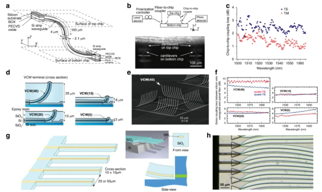 a–c 参考文献164(经参考文献许可转载。164©美国光学学会)。在(a)中,悬臂联结器的示意图。在(b)中,是封装系统的侧面视图,展示了上下模具上的悬臂以及测量装置。在(c)中,显示了悬臂梁耦合器在TE和TM模态下的波长依赖性。d–f 参考文献168(经参考文献许可转载。168©美国光学学会)。在(d)中,横截面视图展示了不同悬臂锥度长度的离子植入悬臂耦合器的材料系统(VCW(40)代表具有40微米长悬臂的垂直曲面波导)。在(e)中,展示了通过离子植入制造的悬臂联结器的透视图。在(f)中,数据显示了不同偏振和悬臂锥度长度下,悬臂梁与透镜光纤之间的损耗耦合(将这些值加倍可以粗略估算波导与波导耦合)。(g)中,是用于晶圆级、InP器件自动探测的SiON悬臂边缘耦合器示意图;(h)中,是左侧SiON探头、右侧InP波导的俯视实验图像,经过被动组装后173(©2021 X. Leijtens 等,依据 CC BY 4.0 授权)