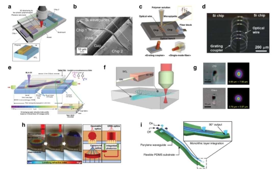 a, b 光子线键(PWB)178(经参考文献许可转载。178©美国光学学会)。在(a)中,介绍了TPP打印PWB芯片间耦合的机制。在(b)中,一组一组PWB与SOI耦合的SEM图像。c, d 直接光线键(DOWs)(经参考文献许可转载。179©Optica出版集团)。在(c)中,利用微加工玻璃喷嘴打印芯片间耦合的DOW的机制。在(d)中,制造的DOW显微图像。在(e)中,SmartPrint技术的示意图包括聚合物波导的分级折射曲线和带有聚合物交叉锥的IOX波导横截面视图(经参考文献许可转载)。180©2022年IEEE)。f, g 3D ULI波导耦合器(经参考文献许可转载)。163©2018年IEEE数据)。在(f)中,展示了3D ULI制造的示意图,并放大了使用绝热锥形硅片到ULI波导耦合的终端终端。在(g)中,一组ULI波导截面,采用商业化的鹰形玻璃基板和LPCVD氧化层包覆,并采用测量的光学模式剖面。在(h)中,展示了SCRIBE技术用于在间孔硅中形成独立微光学器件64(©2020 Ocier 等,依据 CC BY 4.0 授权)。在(i)中,为光学连接用的柔性辅助波导示意图,带有镜面端面185(©Reddy 等人,CC BY 4.0 许可)