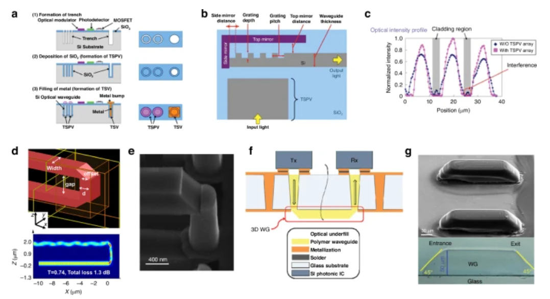 a, b 透视和横截面图像,展示硅中光子通孔(以及消逝的层内耦合器和ULI光纤到硅)3N4耦合器)实现了 SiPh-FGDRAM 芯片的三维堆叠,并连接到基底层的 SiPh 逻辑层(经参考文献许可转载)。193©2020年IEEE数据)。在这些图像中,光电探测器和调制器位于SiPh-FGDRAM芯片上。