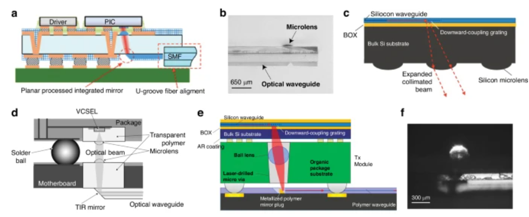 在(a)中,一个光子通孔通过玻璃中介器耦合,使用背面TIR镜,带有顶部透镜和片上光栅耦合器(经参考文献许可转载)。208©2016年IEEE评审)。b–d OptoBump 技术用于通过石英基板进行耦合,使用切丁的45° TIR镜面和分发式微透镜(经参考文献许可转载)。218©2003年IEEE在(c)中,表面光栅背面刻蚀硅微透镜用于通过硅光学耦合(经参考文献许可转载)。207©2019年IEEE数据)。在(d)中,使用了与(b)所示相同的OptoBump技术,只是采用了有机基底(经参考文献许可转载)。218©2003年IEEEe、f A光栅耦合器、镶嵌红宝石的蓝宝石球透镜插入激光烧蚀形成的腔体中,以及一面金属涂层聚合物镜面用于通过有机基底进行耦合(经参考文献许可转载)。206©2020年IEEE)