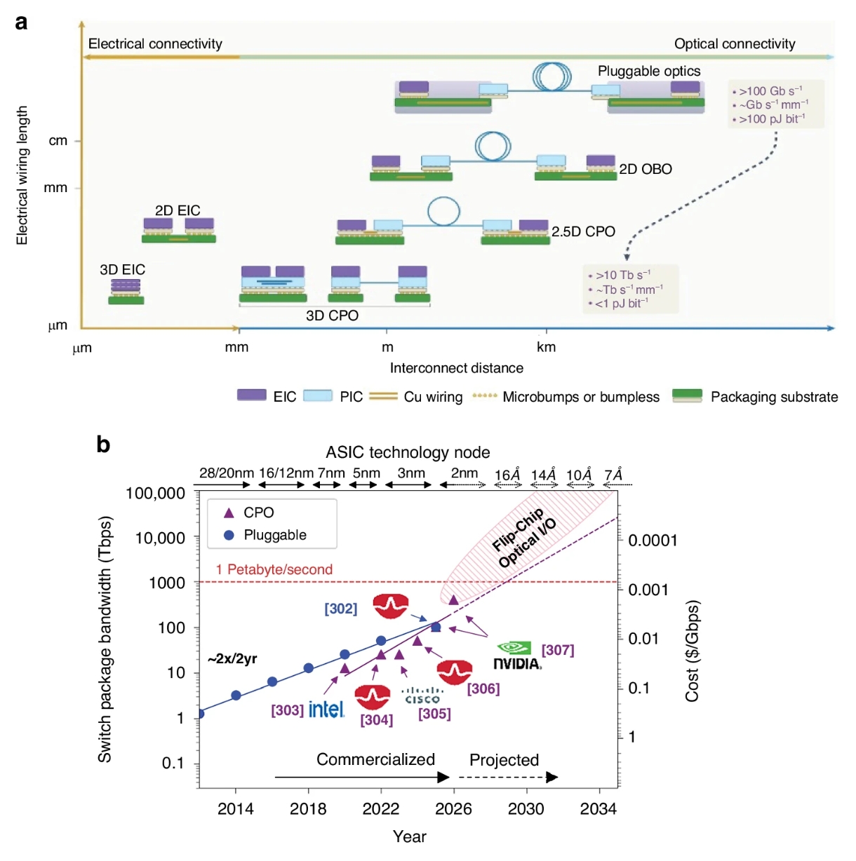 在(a)中,有一张图展示了不同开关系统架构,在封装层面电子-光子集成度不同,范围从可插拔光学到三维 CPO242(经SNCSC许可转载)在(b)中,一个表示集成翻转芯片光学I/O引入导致缩放变化的图。实心蓝线显示了过去十年因可插拔收发器系统而导致的商业交换机包带宽指数级增长235,375,376.虚线紫色显示了未来十年基于CPO的缩放趋势的预测。右轴表示包带宽的提升伴随着每比特成本(每秒)的提升。上轴表示每次交换机封装带宽的提升都需要更先进的技术节点来扩展ASIC性能。这些点名重点介绍了成功商业化CPO系统的制造商377,378,379,380,381.阴影粉色圆圈展示了翻转芯片光I/O的采用不仅持续指数级扩展,还能提升扩展率,从而极大加速>1 Pbps封装I/O带宽的交换机的发展。