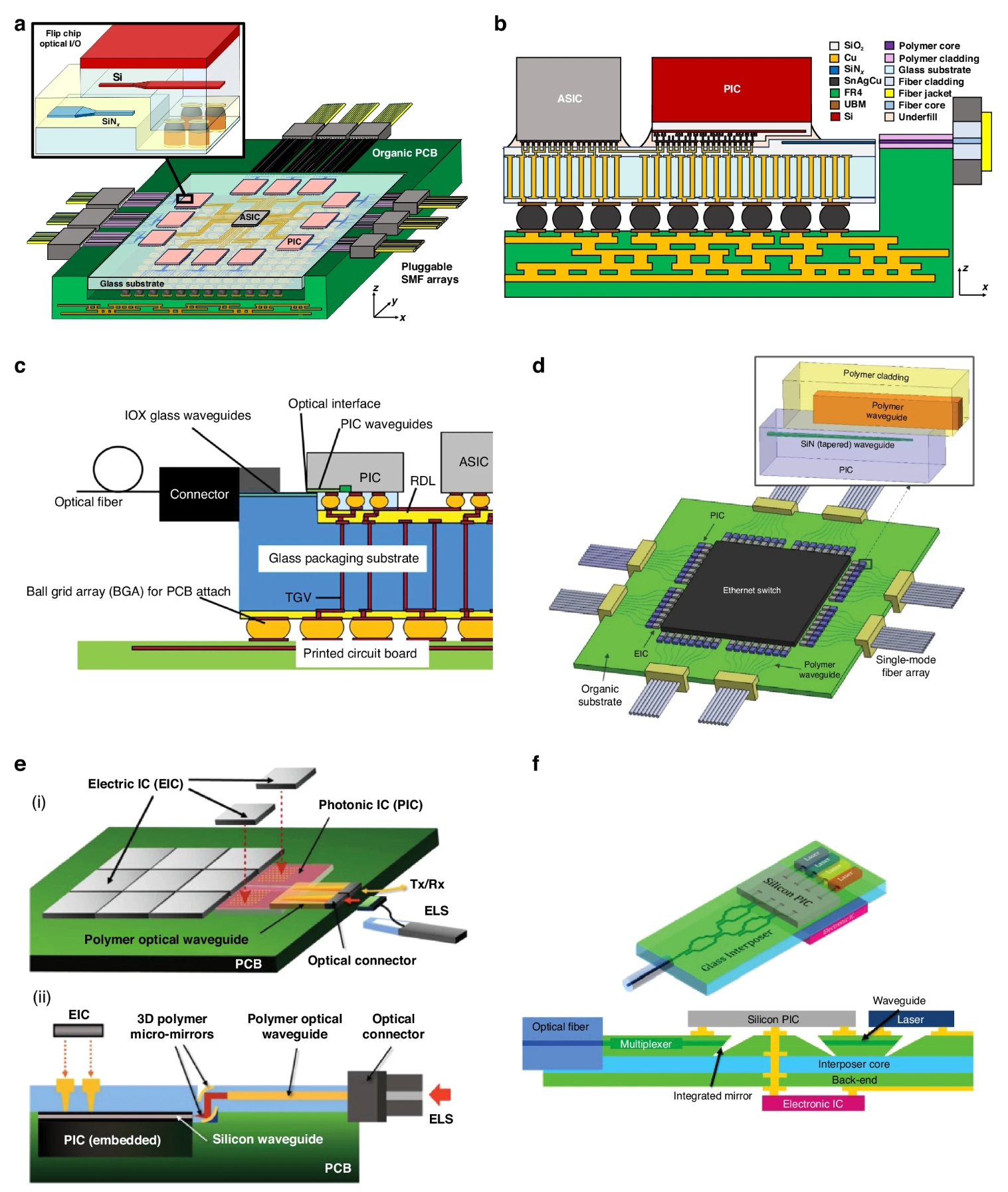 在(a)和(b)中,翻转芯片SiNx转为SOI消逝耦合器,配备Cu μ柱凸起,用于Pbps I/O。153(©2025 Weninger 等,CC BY 4.0 许可)。在(c)中,IOX转SOI的消逝耦合器集成于焊点和TGV中,用于光学和电气扇出(经参考文献许可转载)。249©2023年IEEE数据。在(d)中,有机封装基板包含聚合物波导,通过翻转芯片消逝耦合器连接到收发器PIC上的SiN波导(经参考文献许可转载)。251©Optica出版集团)。在(e)中,嵌入SOI收发器于有机基板中,采用封装级聚合物波导和GSL图案曲面镜进行光学耦合。382(©S. Suda 等,依据CC BY 4.0授权)。在(f)中,这是一个CPO设计,涉及光子和电子芯片分别安装在玻璃封装基板的不同侧,并利用芯片间耦合器实现光学连接(参考文献中转载)。131,经AIP出版社许可)