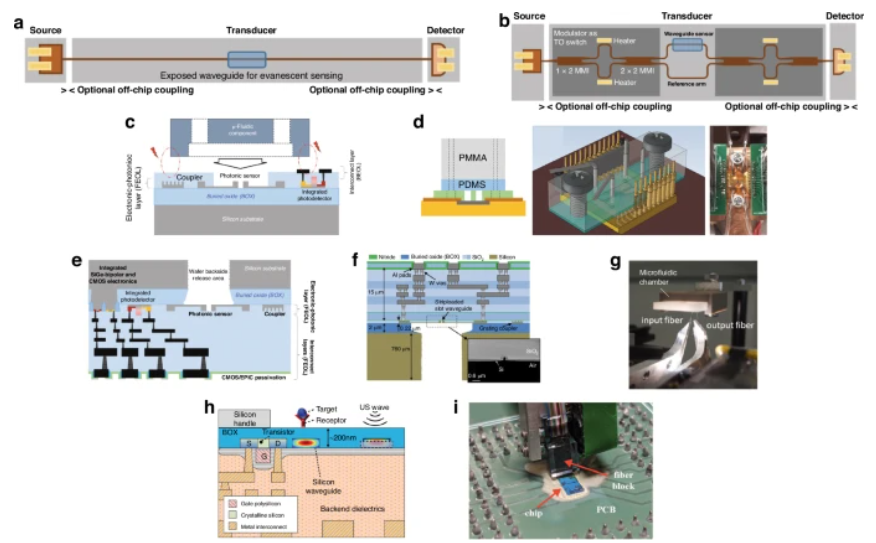 在(a)和(b)中,分别是一个带有顺序引用的简单消逝传感器和一个集成开关的传感器,以实现准确且高效的引用。每张图中的断点表示,如果源和/或检测器未完全集成,则需要芯片间耦合的断开257(©2024 C. Mitchell 等,依据 CC BY 4.0 授权)。c 展示了一个通用的顶部可访问架构,假设集成光电探测器(重印自参考文献)。258©, 2022 A. Mai 等人,获得爱思唯尔许可,并依据 CC BY-NC-ND 4.0 授权)。在(d)中,采用顶部架构的全封装主动SiPh生物传感器的示意图和实验图像(转载自参考文献)。259©2018年,爱思唯尔有限公司许可。在(e)中,这是一个通用的背面可访问布局,假设集成光电探测器和电子元件在同一芯片上(摘自参考文献)。258©, 2022 A. Mai 等人,获得爱思唯尔许可,并依据 CC BY-NC-ND 4.0 授权)。在(f)中,PIC的横截面,包括集成的MRR传感器、光电探测器和采用局部背面蚀刻技术的光栅耦合器262(©2020 P. Steglich 等,依据 CC BY 4.0 许可)。在(g)中,一个采用背面布局的完整封装被动硅生物传感器(转载自参考文献)。258©, 2022 A. Mai 等人,获得爱思唯尔许可,并依据 CC BY-NC-ND 4.0 授权)。h, i 部分背面蚀刻架构与全封装有源硅芯片并列展示263(©2021 C. Adamopoulos 等,依据 CC BY 4.0 授权)