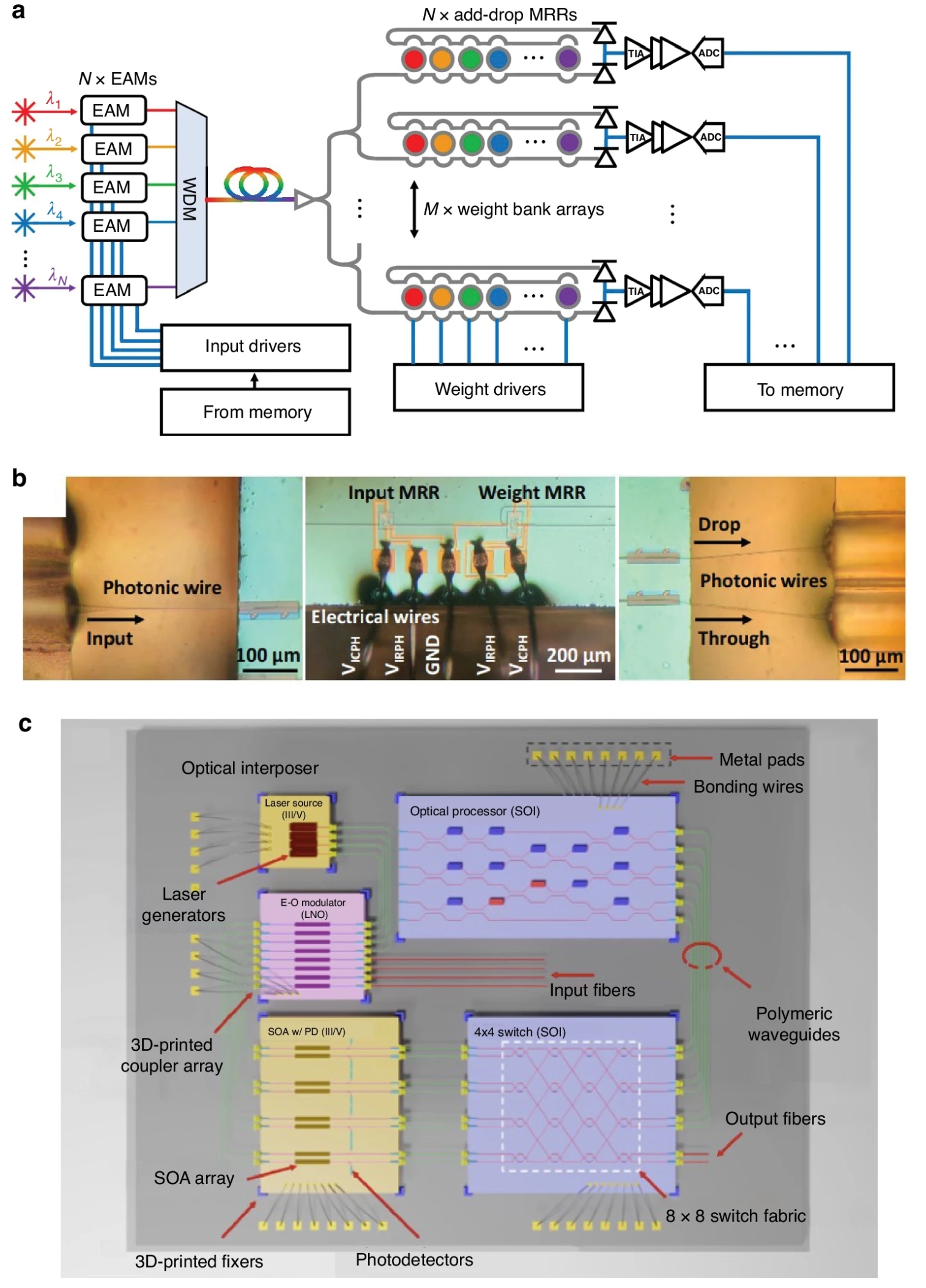 a, b 采用多波长架构并采用广播和权重方案的光子计算单元示例265(©2023 Luan 等,依据 CC BY 4.0 许可)。(a)中的布局展示了如何利用WDM将波长合并为单一输入通道,该通道再分为M通道,每个通道包含N个调制器和权重组调制器,这些调制器最终以M个光电探测器结束。(b)中的上图展示了使用PWB和电线结合的光学和电气扇出。c 一个拟议的光子计算架构示意图,其中激光器、光学处理器、光学开关和SOA通过聚合物介质波导和TPP打印的微反射器连接起来142(©2024 H. Huang,CC BY 4.0授权)