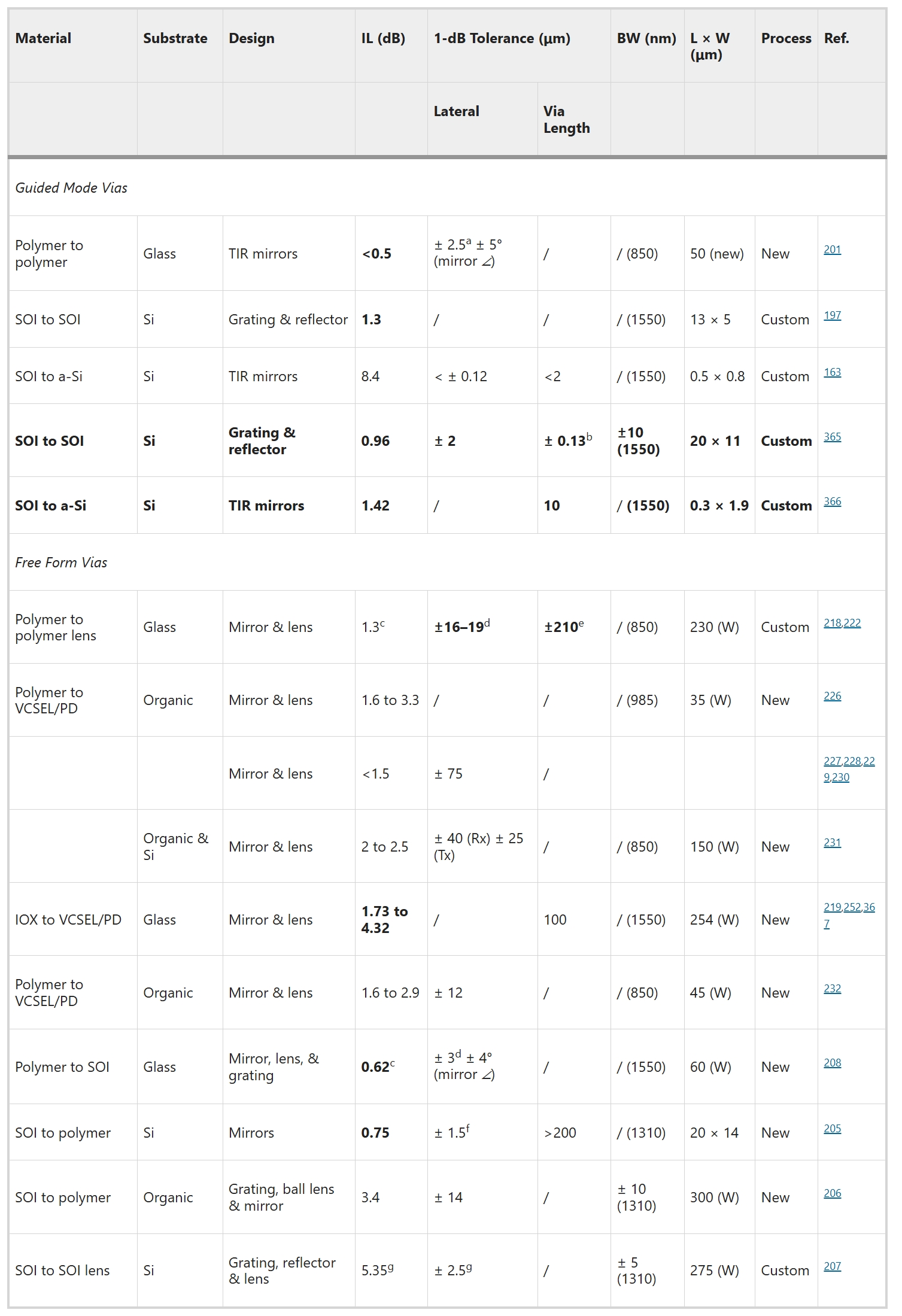 自由形孔的设计通常包括TPP或GSL镜、45°镜面,或一个光栅,用于将光线以90°反射到基板中。从那里,对面可能有另一个反射器用于同一芯片层间的耦合,或者带有微透镜以准直束流,使其能够引导到第三个翻转芯片结合芯片的芯片。解决后者挑战的设计对未来3D集成光子封装非常重要,因为目前的重点大多集中在芯片间或芯片间的耦合上,而未涉及光学芯片对板和中介器到板上的连接。有两个因素使此变得困难:较大的垂直距离(>>100微米)以及片上或介界面波导与板级波导之间的折射率差异较大。利用自由形通孔的设计有望为未来利用无纤维技术的光学印刷电路板克服这两个挑战提供途径。此外,多项研究探讨了完全蚀刻的气孔与通过透明基底传播的性能205,206,207,208.由于广泛使用不同的介界面材料,包括硅、玻璃和有机基底,因此将单独分段涵盖每种情况。