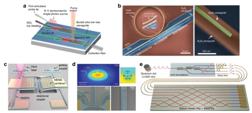在(a)中,消逝耦合器用于将可选置的GaAs量子发射体连接到超低损耗硅3N4无源电路288(©2022 年 Chanana 等,依 CC BY 4.0 授权)。在(b)中,一个消逝耦合器(右)用于连接晶圆键合的GaAs发射器和GaAs微环谐振腔(左)到硅3N4无源电路289(©2017 Davanco 等,依据 CC BY 4.0 授权)。在(c)中,一个可重构的Si3N4使用MEMS器件的电路与NbTiN SNSPD短暂耦合283(©2021年Gyger等,CC BY 4.0授权)在(d)中,一个横截面模拟(上图)展示了LiNbO的材料堆栈和耦合3NbTiN SNSPD的波导和假彩色SEM图像显示集成探测器位于金垫(左)和波导弯曲处(右)284(©2021 年 Lomonte 等,依 CC BY 4.0 许可)。在(e)中,提出了一种混合集成量子光子处理器架构,其中QD、LNOI调制器、硅3N4被动元件和SNSPD是光学连接的292(经SNCSC许可转载)。