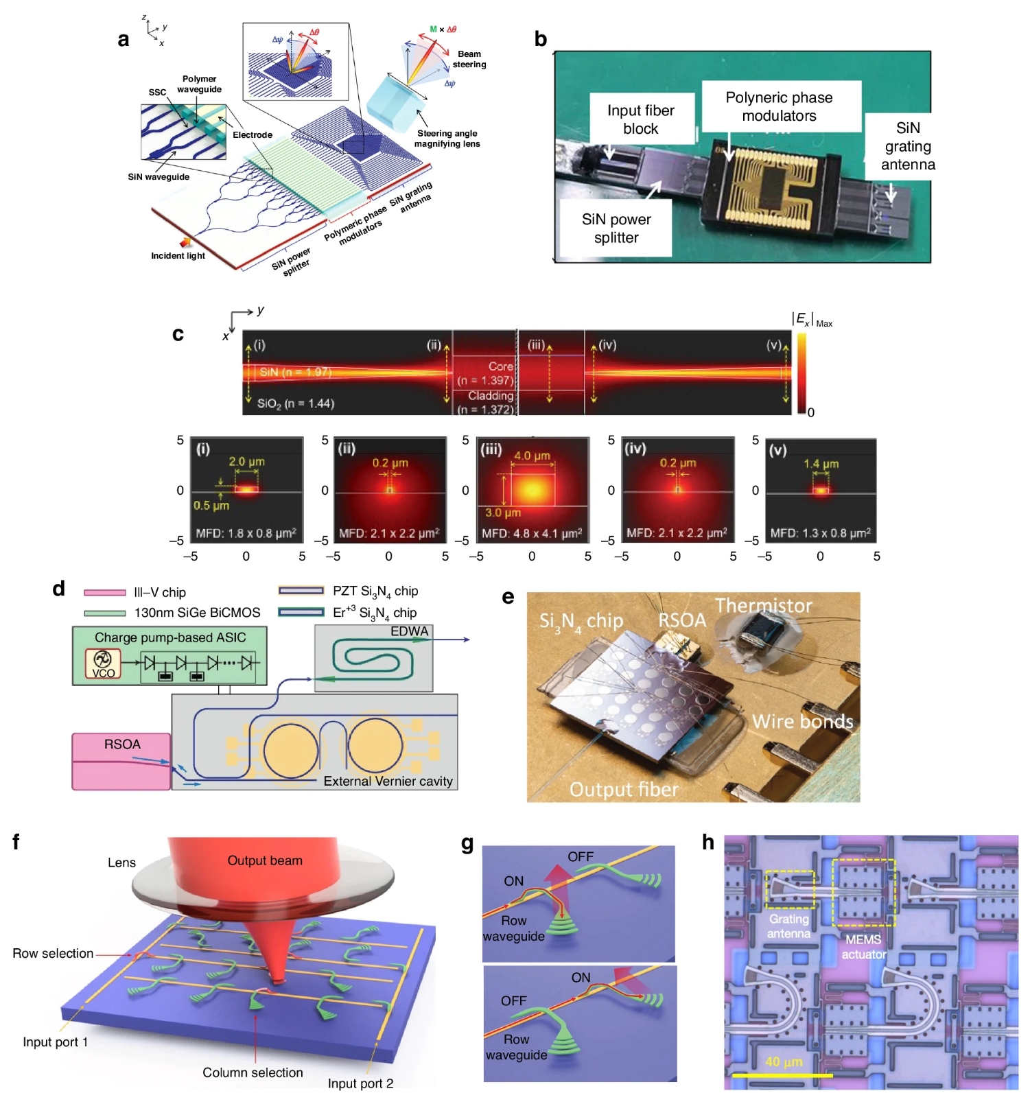 在(a)中,这是通过组装多个独立硅而构建的激光雷达系统示意图3N4分光和发射芯片,采用聚合物热光相位移芯片,采用边缘耦合,最终封装系统见(b)和光学模通过SiN转换为聚合物边缘耦合器的过程(c)(经参考文献授权转载)。308©2021年IEEE数据)。在(d)中,展示了由III-V反射SOA芯片边缘耦合到硅原子形成的相干激光雷达发动机的示意图3N4带有微调腔的模具,(e)显示完整封装结构298(©2024 Lukashchuk 等,依据 CC BY 4.0 授权)。在(f–h)中,示意图和一张俯视显微镜图像,展示了基于MEMS的消逝波导到波导耦合器作为OPA单元开关的图像3(©2022年,X. Zhang 等人,CC BY 4.0授权)