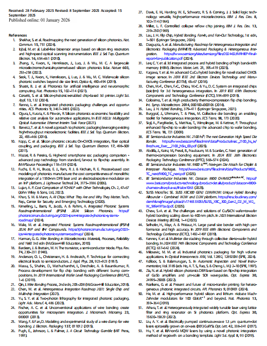 上述键合和碰撞技术中,自动选置芯片和晶圆键合机的作用至关重要。这些先进工具能够高速同时实现高精度的芯片或晶圆对准,通常还配备了环氧树脂分配、加热尖端和阶段以及紫外线(UV)固化灯等额外功能。正如人们所预料的,这些工具在速度(即吞吐量)和校准精度之间存在权衡,这在转向越来越小的凸起音距时尤为重要。用于质量回流前芯片连接的标准拾取与放置工具,其对准精度为10–20微米,吞吐量可达每小时18,000单位以上(UPH)38,对于安装精度<3微米,速度为>2000 UPH(假设每键1–2秒)的精度模型也存在34对于TCB来说 39,40,以及精度最高的芯片键合器能够对准到<0.3微米,速度可达2000 UPH进行混合键合41.晶圆键合机通常比芯片键合机提供一个数量级的对准精度,工具在300毫米晶圆上可提供<50纳米精度42以及通过实验证明的Cu–Cu界面键后精度为<150纳米43. 在研究阶段,企业也在转向面板级粘结机,以实现玻璃或有机物等基板的全部潜力,这些材料可在面板层面制造44. 在电子领域,集合D2W或面板级组装与三维架构中的混合键合结合,已证明可实现<2微米的最终精度45对于最先进系统性能的持续指数级扩展,可能至关重要。然而,将这些先进的翻转芯片封装技术应用于光子学,可能对未来的电子光子系统产生同等甚至更大的影响。