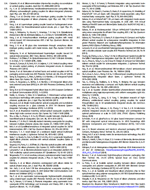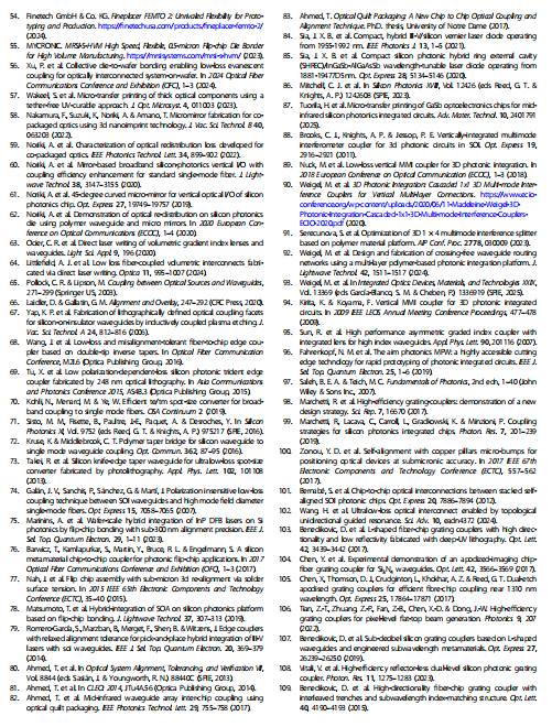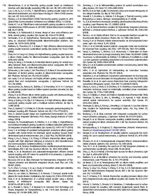 回顾来看,本文讨论了利用边缘、光栅、消逝、自由形和悬臂耦合器以及光学线键合技术实现的芯片间和芯片内光的耦合。在不同基底材料(包括硅、玻璃和有机物)的背景下,讨论了通过导向模式或自由形孔将光通过PICS耦合的方法。讨论了这些耦合器在相关应用中的当前及未来应用,包括数据中心开关封装、生化传感器、光耦合存储器、光学计算、集成量子光子学和激光雷达系统。从所呈现的数据中可以看出这些技术在集成光子系统中将发挥的关键作用。