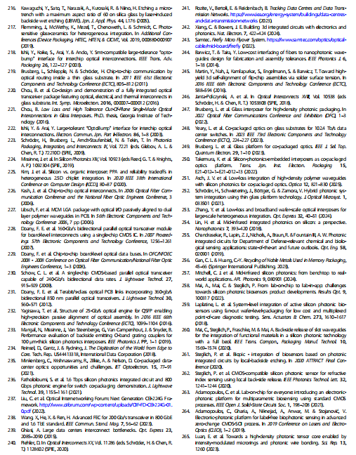 虽然这些例子展示了利用芯片间光输入输出在扩展数据容量方面可能带来的显著改进,但它们也展示了三个重要趋势:(1)封装层向集成波导的转变,(2)利用光扇出技术以支持大面积可插拔光纤接口,(3)对基板(如玻璃)的迫切需求, 这些方法在实现面板级处理的同时,性能优于有机体。此外,还需要对中介器到板上耦合器进行研究,以实现类似微电子领域中嵌入板级Cu线路的球栅阵列时所见的C-SWaP改进28.