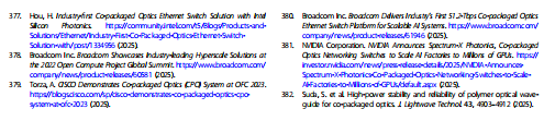 到2025年,全球数据圈预计将增长到175泽字节,全球46%的数据存储在公有云环境中234.为满足需求,数据中心机架顶交换机每两年将总带宽容量翻倍,商业化供应51.2 Tbps交换机封装,配备512个电气I/O,每个机道运行速度为106.25 Gbps,采用IEEE 802.3-ck标准 235,236.每通道200 Gbps的进一步标准化正在进行中 237,238.然而,厘米长板级Cu线路消耗的功耗以及可插拔收发器间距有限,使得持续扩展困难 239,240.这在考虑数据中心的能耗时尤为关键。例如,数据中心在2022年已占爱尔兰所有能源消耗的18%,到2031年,丹麦约有15%的能源消耗将来自数据中心的电力消耗241.