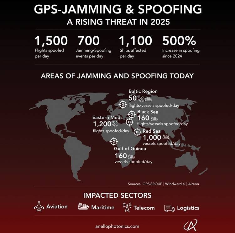 图1 全球导航卫星系统(GNSS)的干扰与欺骗威胁,正对商业及国防领域形成持续升级的影响。(来源:ANELLO Photonics)