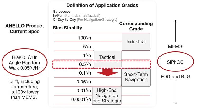 图 2 硅光子陀螺仪(SiPhOG)填补了不同应用等级陀螺仪之间的性能鸿沟。(来源:ANELLO Photonics)