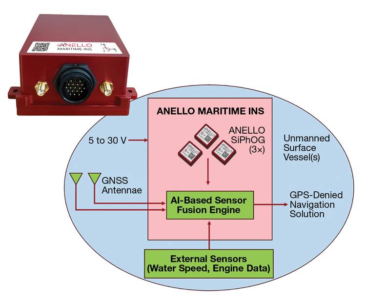 ANELLO 公司研发的海事惯性导航系统(INS),为该技术的实际应用提供了极具参考价值的案例。该系统以三台硅光子陀螺仪(SiPhOG)为核心,搭配三频双天线全球导航卫星系统(GNSS)接收机,并集成了一款专为海事作业的动态特性与实际挑战设计的高精度传感器融合引擎(图 3)。